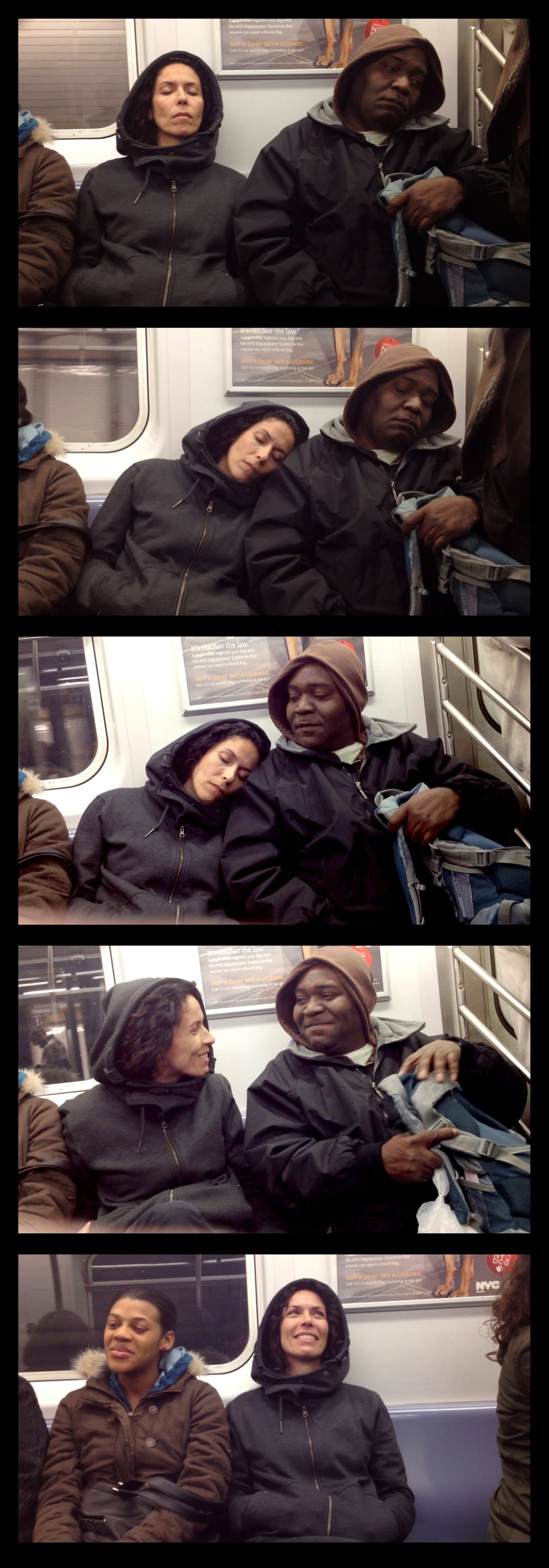 Like Colum McCann writes in Let the Great World Spin, “There is I think, a fear of love.” I’m curious about what we can feel when we remove the fear of certain types of contact (eye contact or resting one’s head on the shoulder of a stranger, for example) and allow ourselves a human closeness. I like to think of removing these types of social barriers — the carving away of psychogenic material — as a sculptural process.