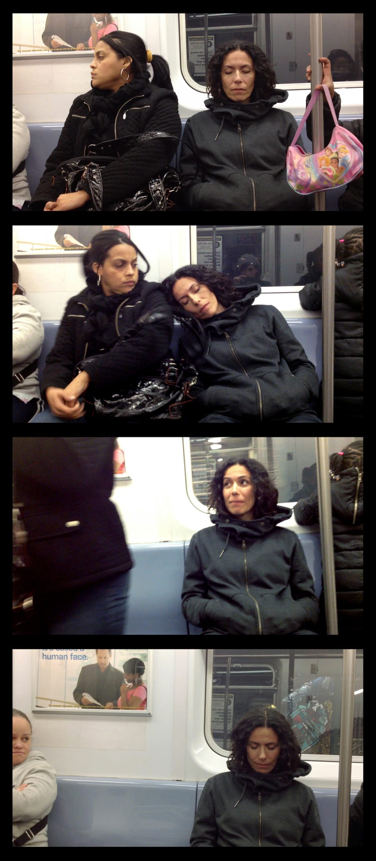 George Ferrandi rides the subway. As passengers push and squeeze and avert their eyes, Ferrandi relaxes her joints and muscles, relinquishing any discomfort or fear that might linger in her posture. When she squeezes into a seat, she refocuses her attention on the border between her body and the body of her neighbor. When Ferrandi feels as though the gap between her and her fellow passenger has closed, when she feels the space has become warm and inviting, she rests her head on her neighbor’s shoulder.