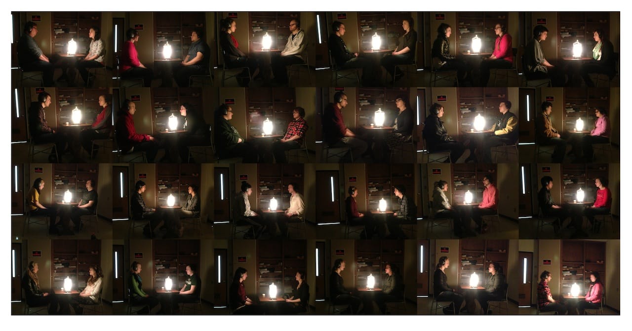 JDW: Earlier this year, Mandy Len Catron wrote about her experience recreating psychologist Arthur Aron’s study on romantic love in the New York Times. In Dr. Aron’s study, two people sit facing each other and ask each other a series of questions. After the participants answer the questions, they stare into each other’s eyes. When I read Catron’s piece in Modern Love, I immediately thought of “ok don’t look at the stranger,” how participants continue to gaze into each other’s eyes past the end of the performance.