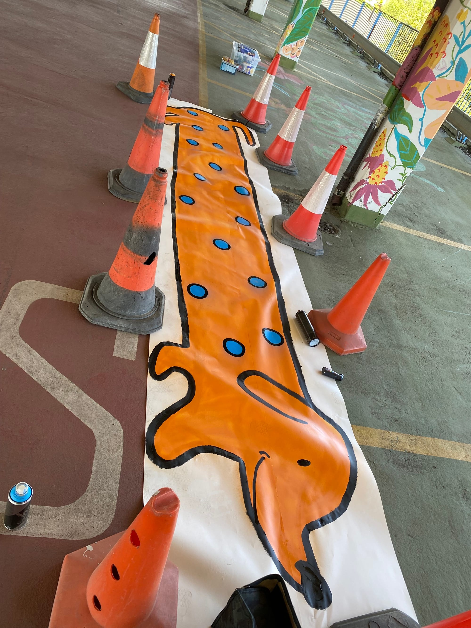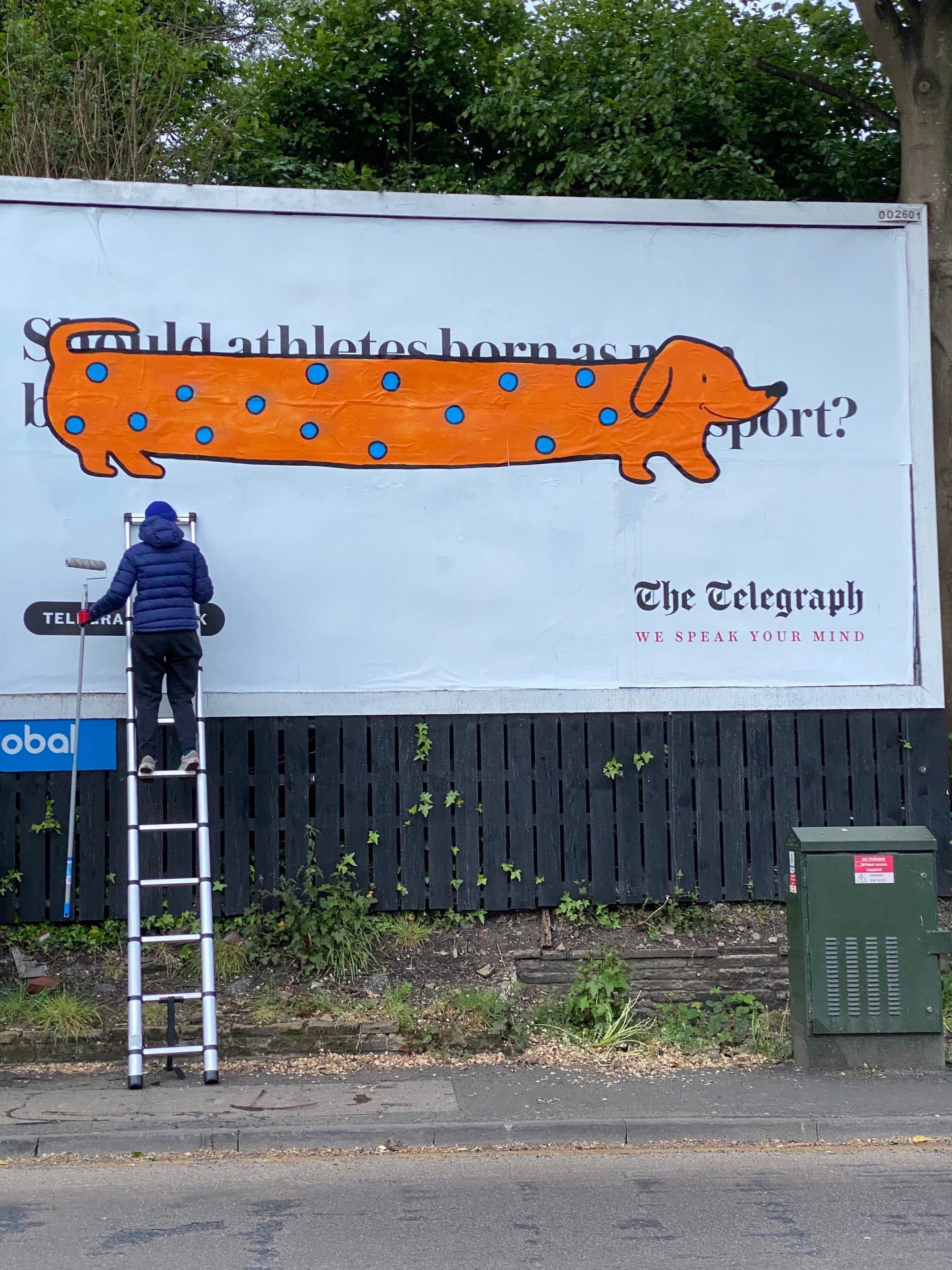 And thus, Saveloy was born. Yaya quickly got to work with some chunky Posca markers and Molotow spray paint to design the enormous orange cartoon Dachshund with a benign smile and blue speckles, and they and their friend pasted Saveloy up over the Telegraph's billboard to the delight of thousands on the internet.