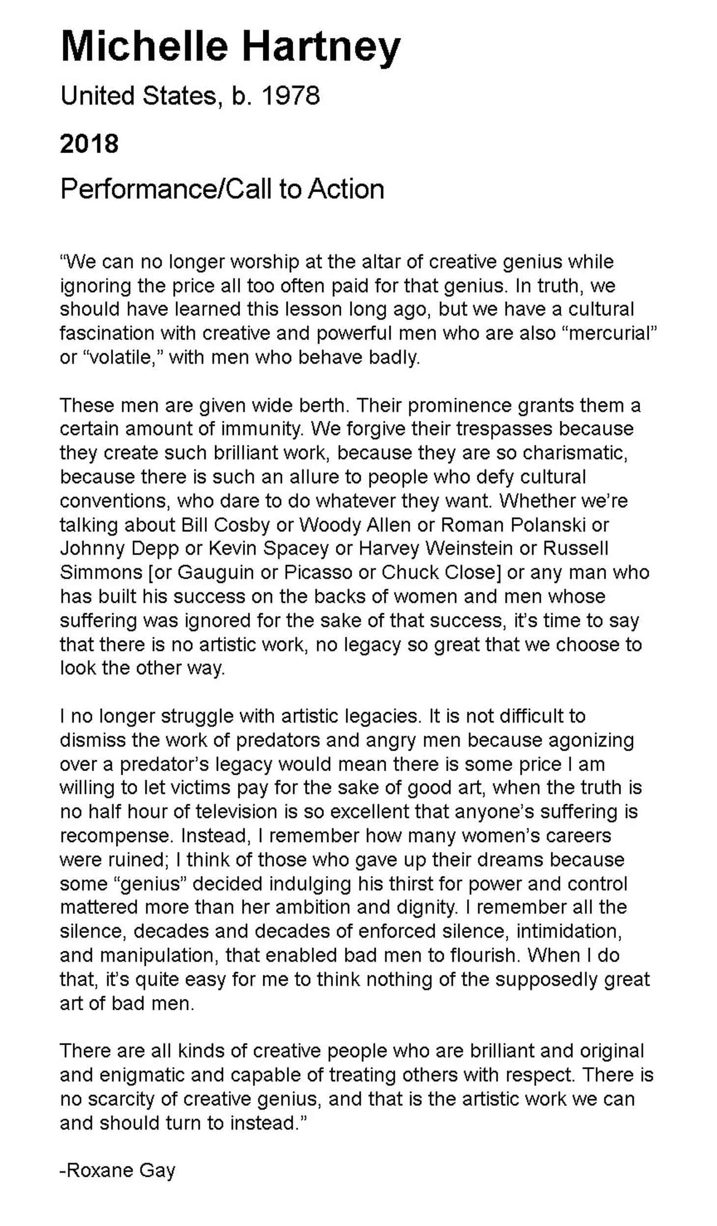 This Saturday, November 3, artist Michelle Hartney stealthily redecorated the galleries of the Metropolitan Museum of Art with a series of plaques wielding feminist messages about artistically heralded but morally dubious male artists like Pablo Picasso and Paul Gauguin.