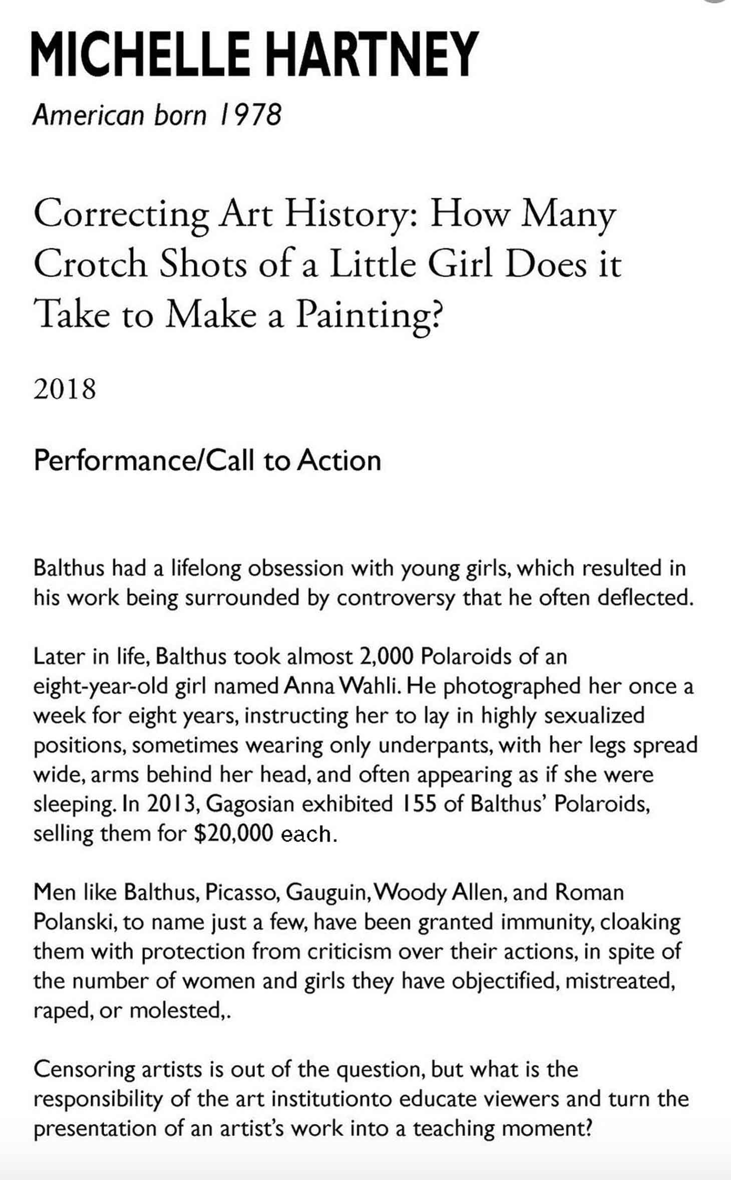 The artist told Hyperallergic that earlier this year she staged a similar protest-performance at her alma mater, the School of the Art Institute of Chicago, which was displaying a painting by Balthus, a painter and photographer known for depicting pre-pubescent girls in sexualized positions.