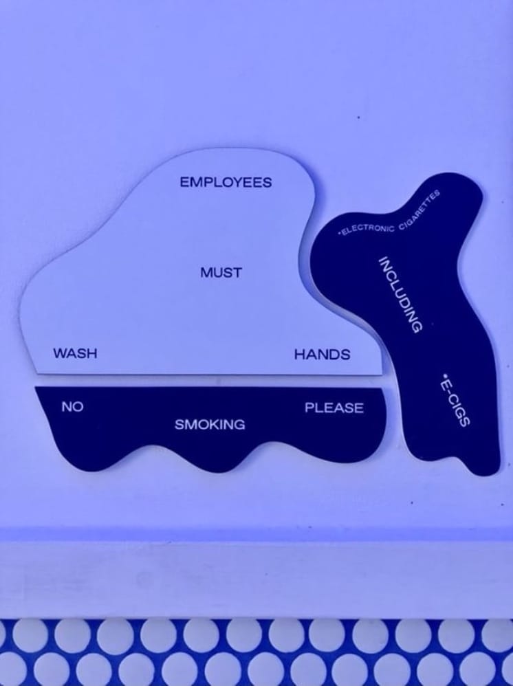 Domicile, another new coffee shop in Brooklyn, paid as much attention to creatively reinterpreting cottage cheese ceilings into a futuristic sea punk interior design as it did to exciting signage. Owner Brianne McCabe commissioned artist Morely Talmor to create squiggly, amoeba-shaped laser cut No Smoking (Even E-Cigs) signs and a Choking Aid Poster featuring playful geometric cut-outs. The MP Shift, a James Beard-award winning restaurant interiors company whose clients include hip, pastel terrazzo-filled restaurants, commissioned Todd Selby, the photographer behind The Selby blog, for the Matter House “Employees Must Wash Hands” signs.
