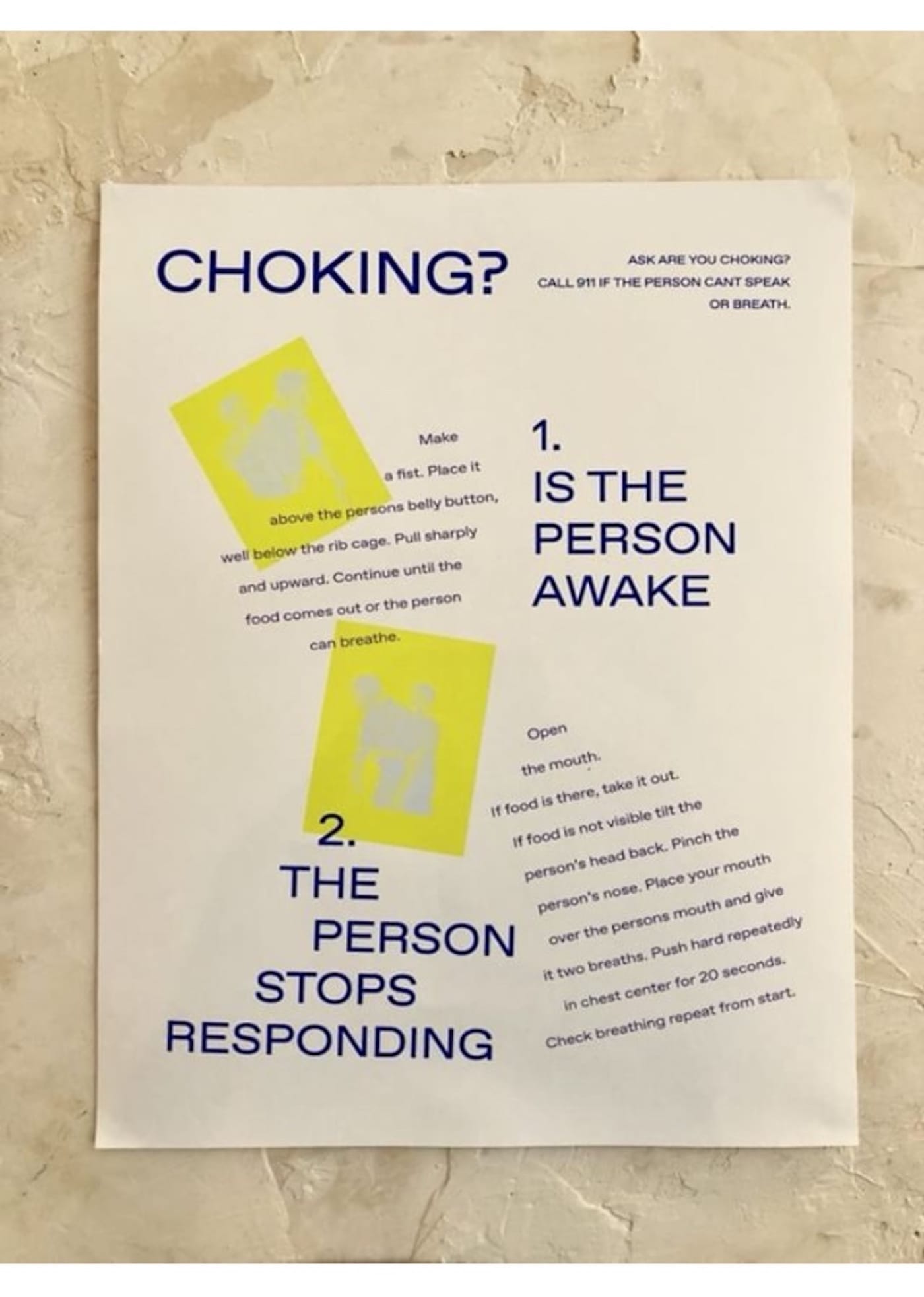 In 1978, shortly after the discovery of the Heimlich Maneuver, New York City introduced its first Choking First Aid poster. The orange-hued design, which the Department of Health distributed to businesses for free, was sloppy, accidentally picturing a hand with six fingers. In the 1990s, Parsons School of Design professor Paul Young and his student Laura Berkowitz redesigned the original poster, with primary-colored, Constructivist graphics picturing a blue character choking on a fish bone. (Though other designs from Young’s class emerged, Berkowitz’s was the most widely dispersed among restaurants.) This was a promising early example of an artist-designed compliance sign, but it didn’t last long: In 2010, the city’s free version of the Choking First Aid poster was updated again to a dull gray design — one that only reinforced the bland homogeneity of many restaurant interiors at the time.