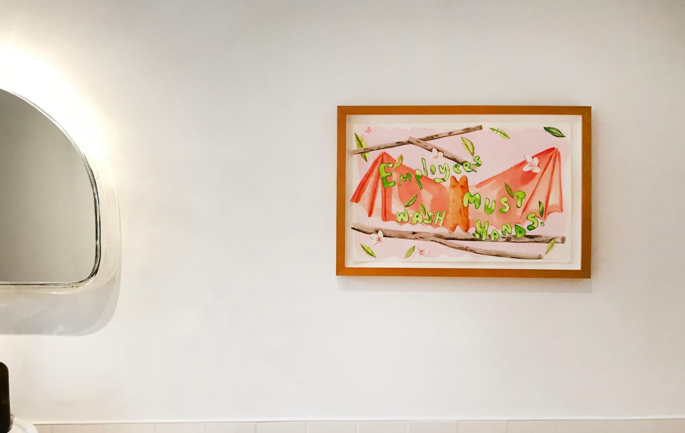 Step into Relationships, a new gallery-cum-coffee space in Brooklyn’s Clinton Hill neighborhood, co-run by Nina Schwartz, a former curator at Salon94 and Gavin Brown’s 356 Mission in Los Angeles. In a departure from her formal gallery training, Schwartz saw this space as opportunity to make art more approachable. Relationships is full of affordable, funky furniture designs, hand-shaped plant holders, and yes, artist-designed compliance signs. In the bathroom, a watercolor of a bat with “Employees Must Wash Hands” written beneath it in slime green bubble letters, designed by artist Nikki Maloof, hovers over the sink.
