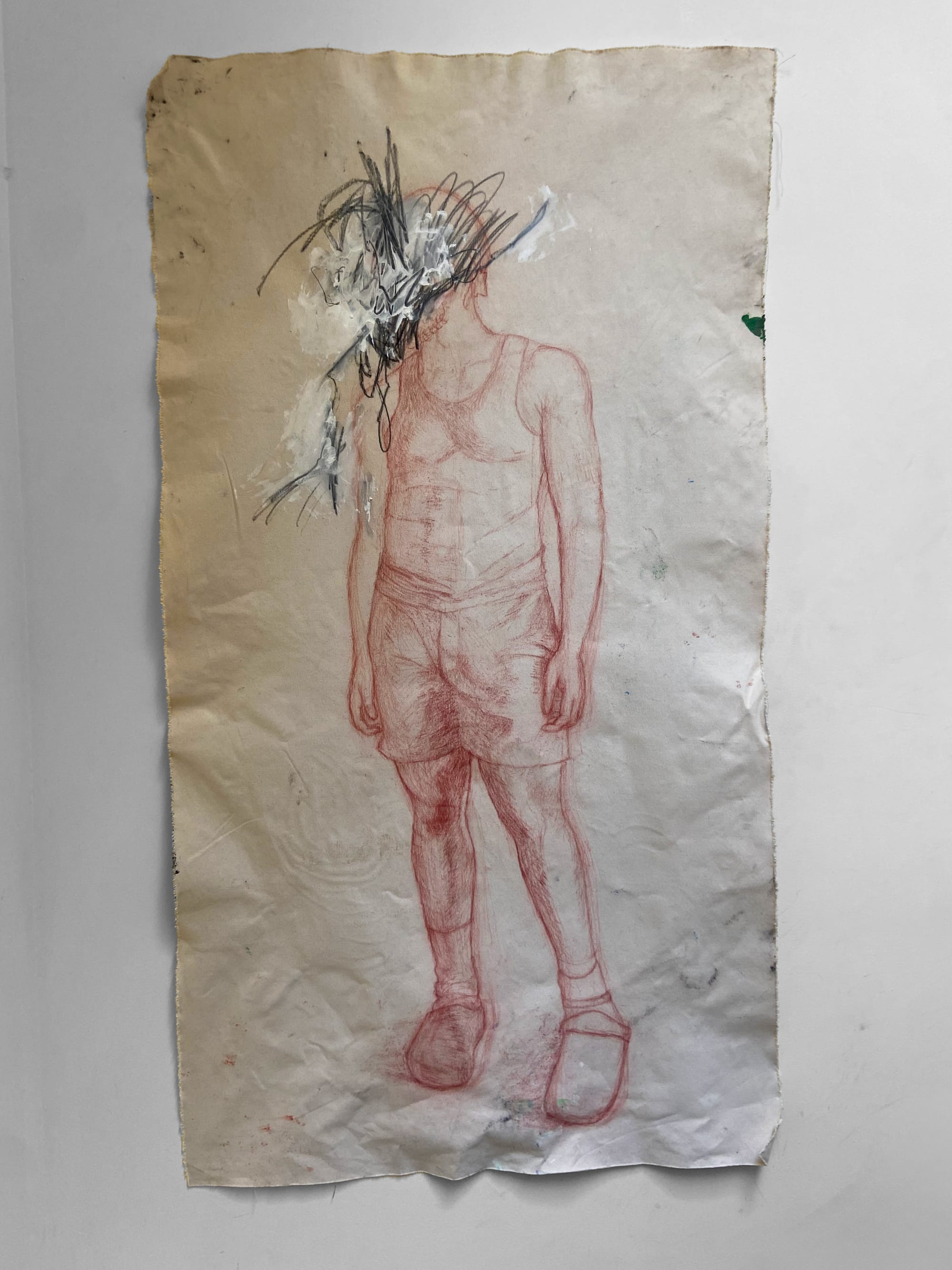 In our conversations, we talked about the curse of perfectionism. I always say that a deadline is the death of creativity, but it’s a necessary stopping point to produce finished work. Hoskins resisted going back to previous work each week and instead started anew. The project tracked peaks and valleys. In particular, weeks 10–15 and weeks 29–33 marked high points, as Hoskins honed his style and married a fluid, geometric aesthetic with mark-making and figuration to depict a journey of self-actualization. In the mark-making of weeks 29–33, he said, “I really enjoyed mixing people drawn with sanguine-colored conte crayon with expressive marks.” This note on “mixing” the marks, another reference to music, reflects the progression’s intimacy. “Pretzel” (2023) is a prime example, as it shows a self-portrait in a twisted position with marks obscuring the face that contrasts with black, blue, and hints of purple of the legs and exposed skin. Perhaps the tornado of strokes reflects the artist’s mental turmoil.
