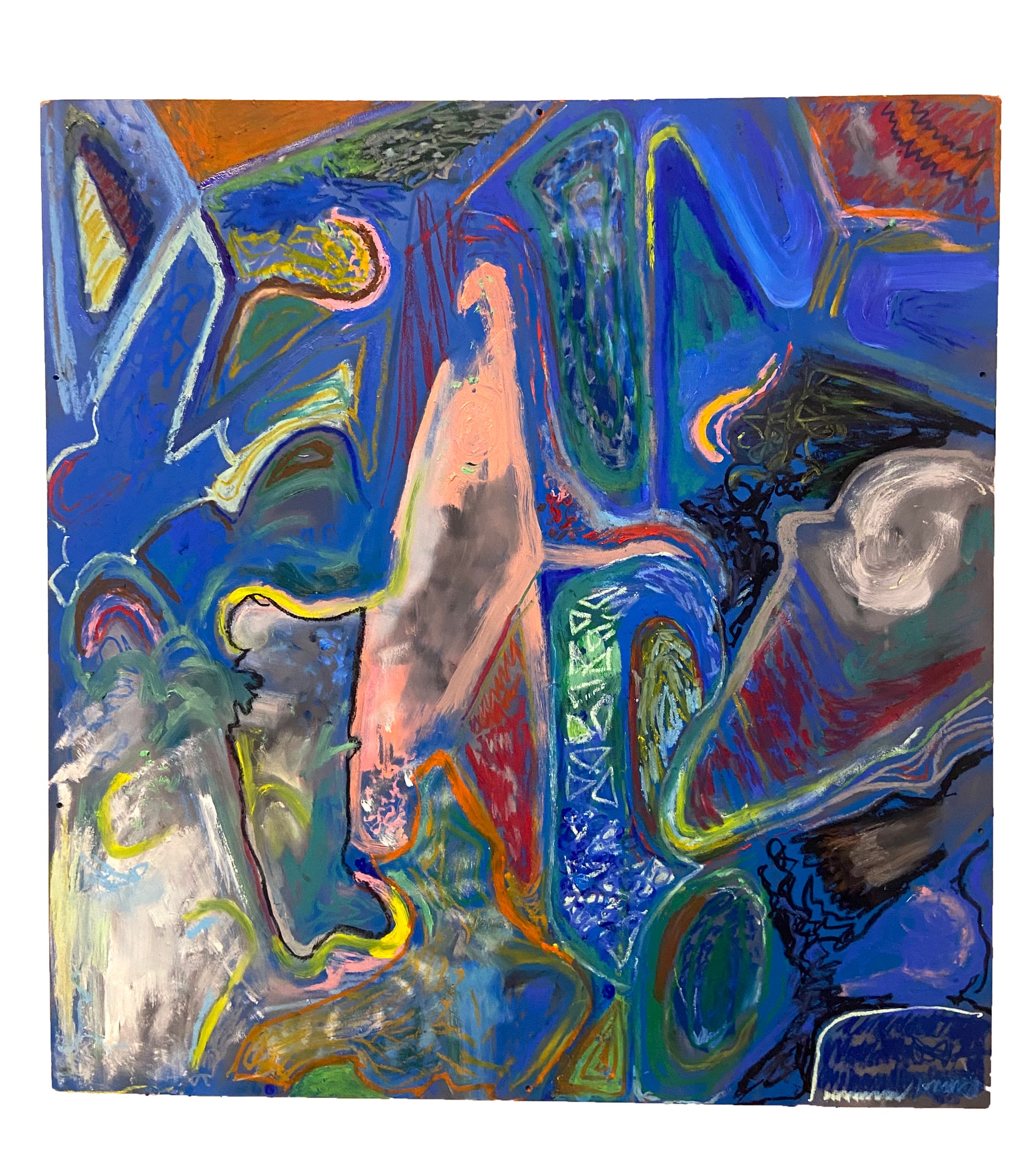 Hoskins and I met during a virtual portfolio review. He sat there in his dorm room amongst the evidence of a working artist — so many canvases that he worried about being “claustrophobic.” I found out that he had begun a challenge of creating work for 52 consecutive weeks. He created new work every week and visually tracked his progress. I was intrigued and kept in touch.