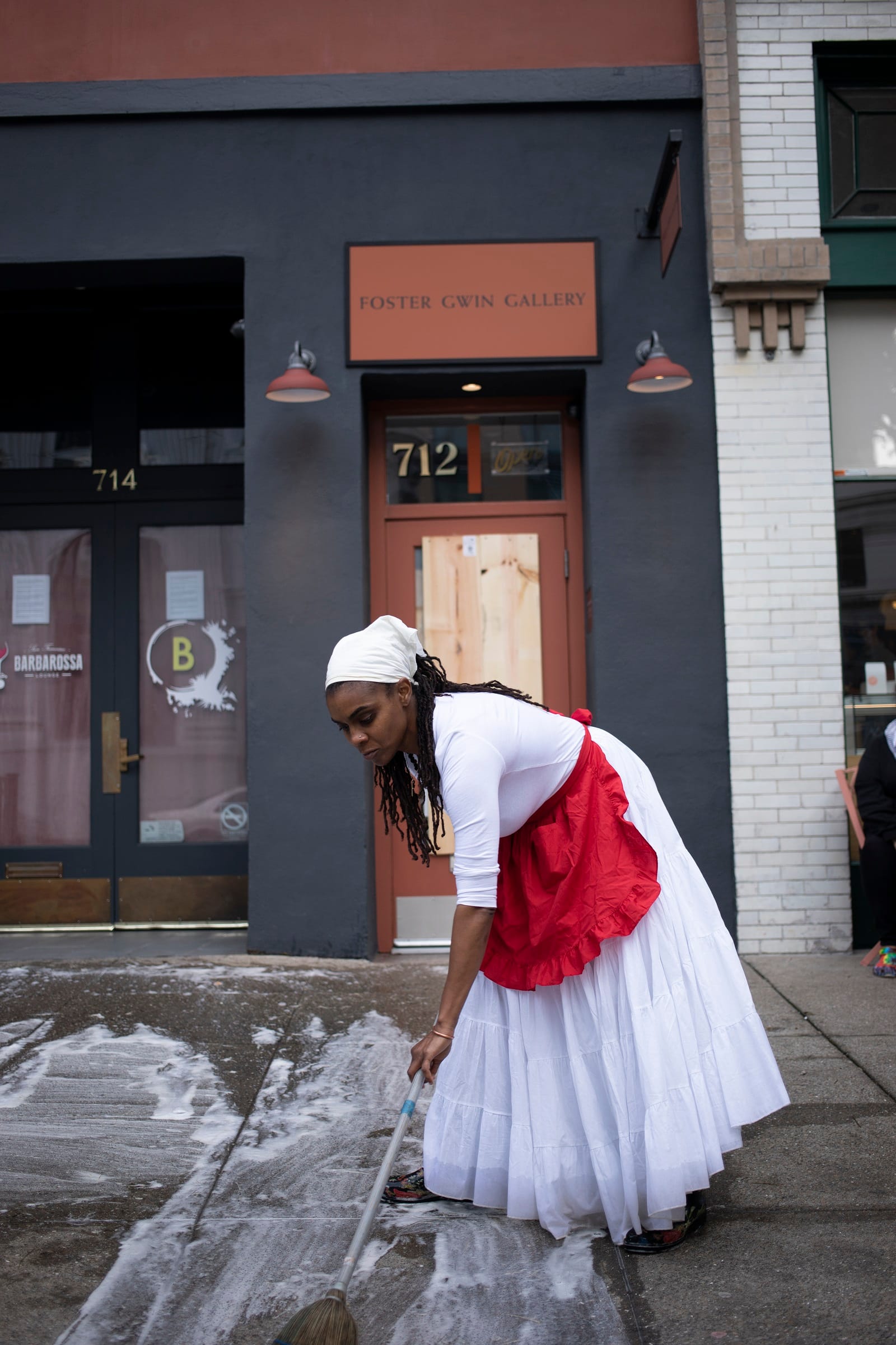 Morris explained that the idea of cleaning the sidewalk originated from an act she used to watch her grandmother undertake. Every so often, the matriarch would scrub the front porch while she sang and prayed. Morris began to appreciate the power of this gesture as she got older.