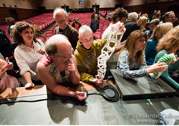 The next guy up is Ken Libbrecht, a physicist from Cal Tech who photographs snowflakes. He has a North Dakota accent and is quite earnest about describing his process. He explains how he lays out a piece of white foam core when it’s snowing to catch the flakes, transfers them to a slide, then gets out his special microscopic camera to photograph them, his hands freezing the whole time. The photographs themselves, projected onto the massive screen at Thorne Hall, are colorful, transparent designs, multifaceted works of art. The audience oohs and ahs. It is very wonderful to see a world that we live with but don’t know in detail. At some point, he tells us that he uses filters on the photographs, to add dimension to the flakes; otherwise, they’re just clear crystals in black and white. Then he says he didn’t use Photoshop, right as he admits that he used Photoshop to doctor the particular image on the screen and the audience laughs. He is an odd and likable character. For no reason at all, he says as a kind of conversational tic, “I have lots of photographs of snowflakes,” like a kid showing you his collection of marbles.