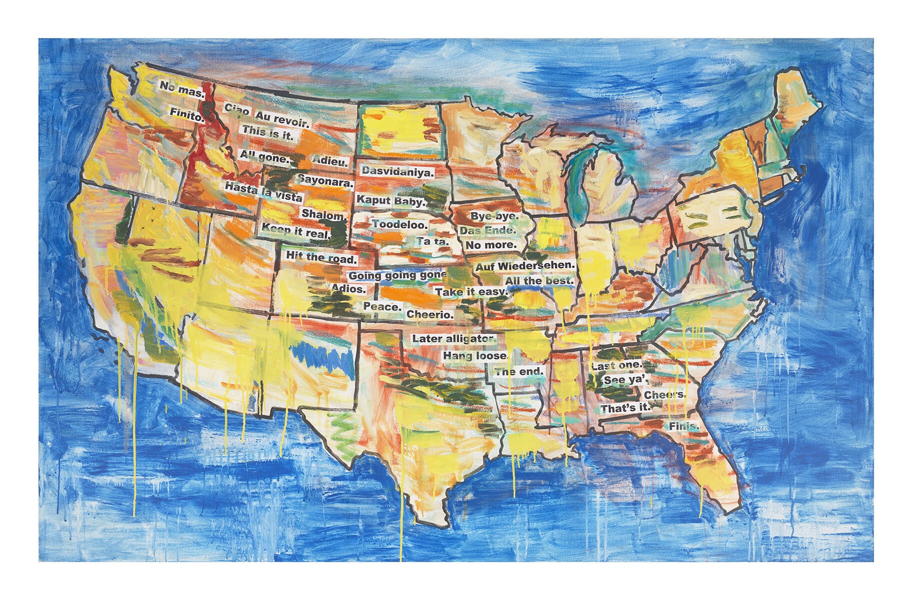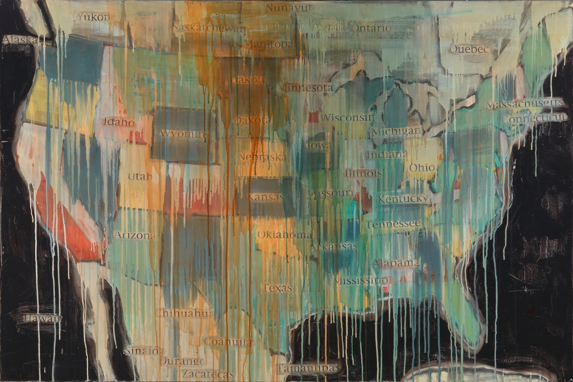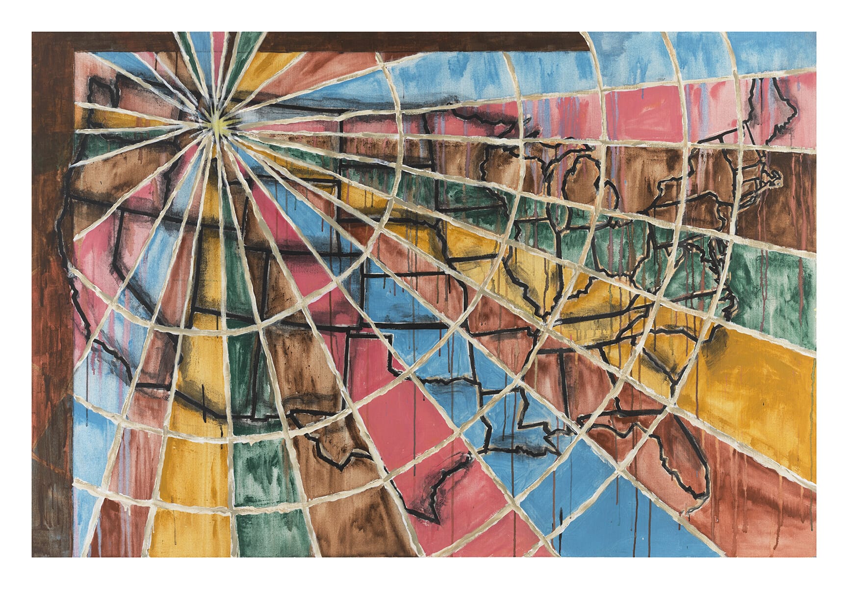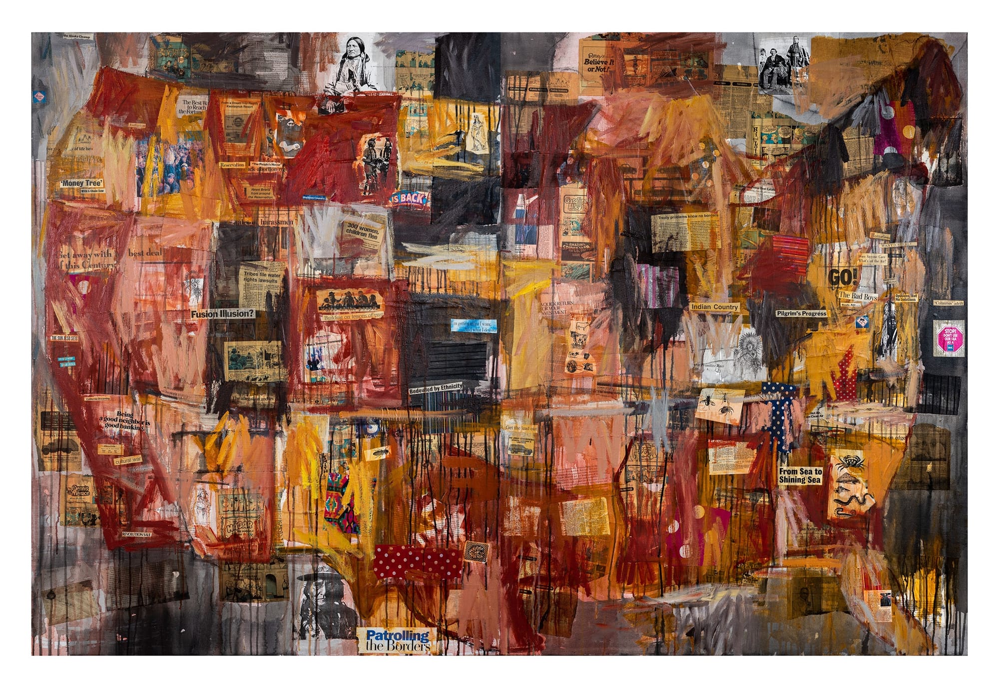 In 1992, as the United States government planned celebrations commemorating the 500th anniversary of Christopher Columbus’s arrival in the Americas, Smith confronted the legacies of Native colonization and genocide, environmental destruction, and contamination of goods through her Trade Canoe series, which layered collaged historic photographs, zoological illustrations, and newspaper clippings with paint and objects. The technique of collage, in addition to her well-known cartographic series that reimagined US state maps to recenter the presence of Indigenous communities, would become quintessential throughout the rest of her artistic practice. These approaches merge in works like "State Names" (2000), in which paint drippings and newspaper clips obscure state names that originate from European colonizers and highlight those with Indigenous roots.