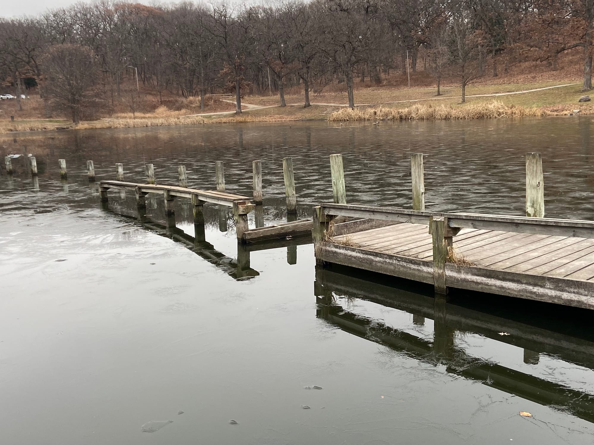 Baum blamed the "ephemeral" nature of Miss's installation, which consists of various wooden, metallic, and concrete landscape features that provided different perspectives of the pondside ecology, as well as Iowa's harsh climate, for the deterioration of the work. She also said that it was not financially feasible to restore the work and that DMAC had put considerable funds toward its maintenance.