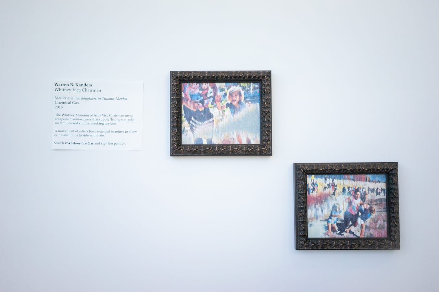 Shimunov’s installation attracted the attention of museumgoers, some of whom began sharing their own harrowing stories of migration. The artist estimates that approximately 70 people saw the guerrilla exhibition in the 30 minutes he monitored it before slipping away unnoticed. It’s unclear exactly when museum officials caught wind of the protest action, which included two artworks recreating the now-infamous images of a mother and her children suffering from a tear gas attack. Alongside the paintings, Shimunov included the following text: