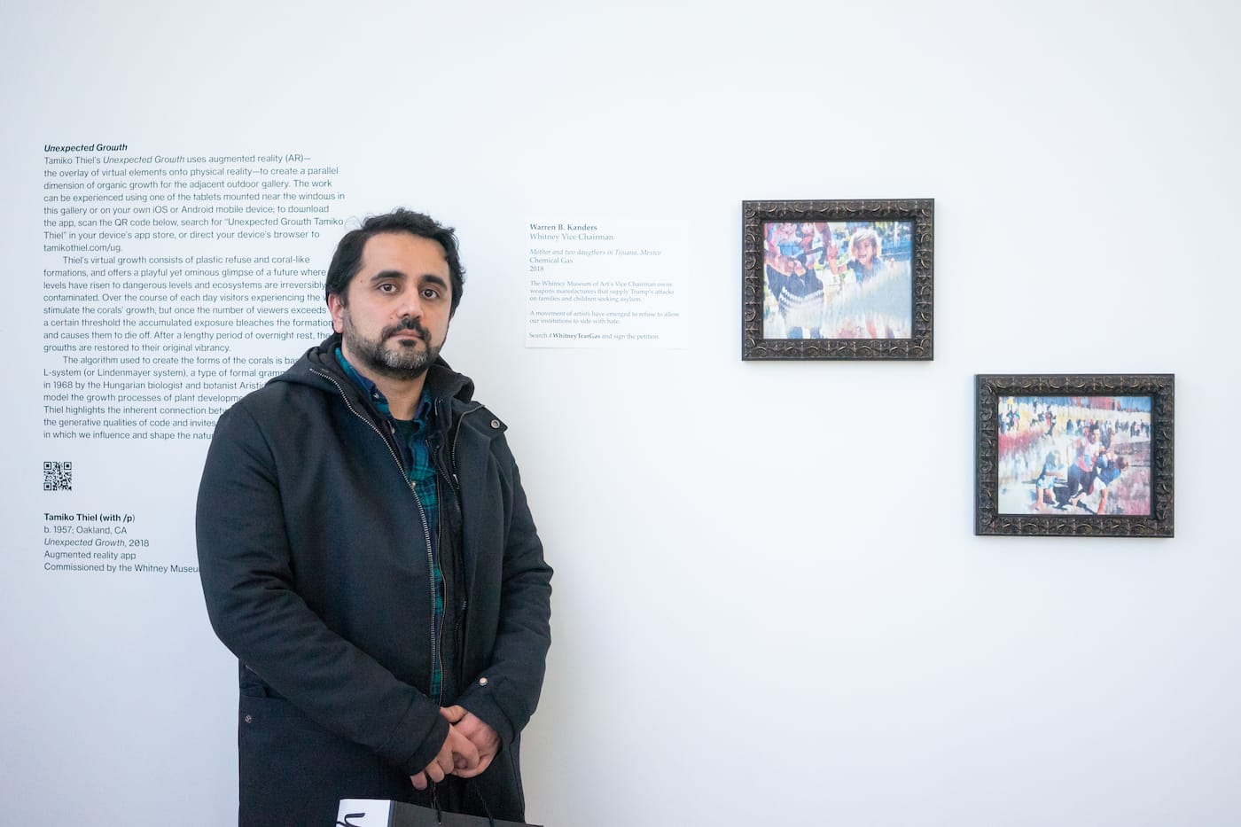 Toward the back of the museum’s fourth floor, he says, was an empty wall with little security detail or surveillance. There, Shimunov and the group Art V War decided to install a miniature exhibition of their own — one commemorating Whitney Museum director Adam Weinberg’s defense of vice chairman Warren B. Kanders, the manufacturer of the tear gas and smoke grenades hurled by US border agents at asylum-seekers in Tijuana, Mexico in late November.