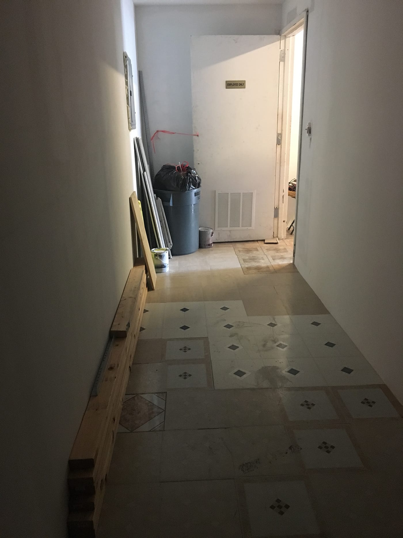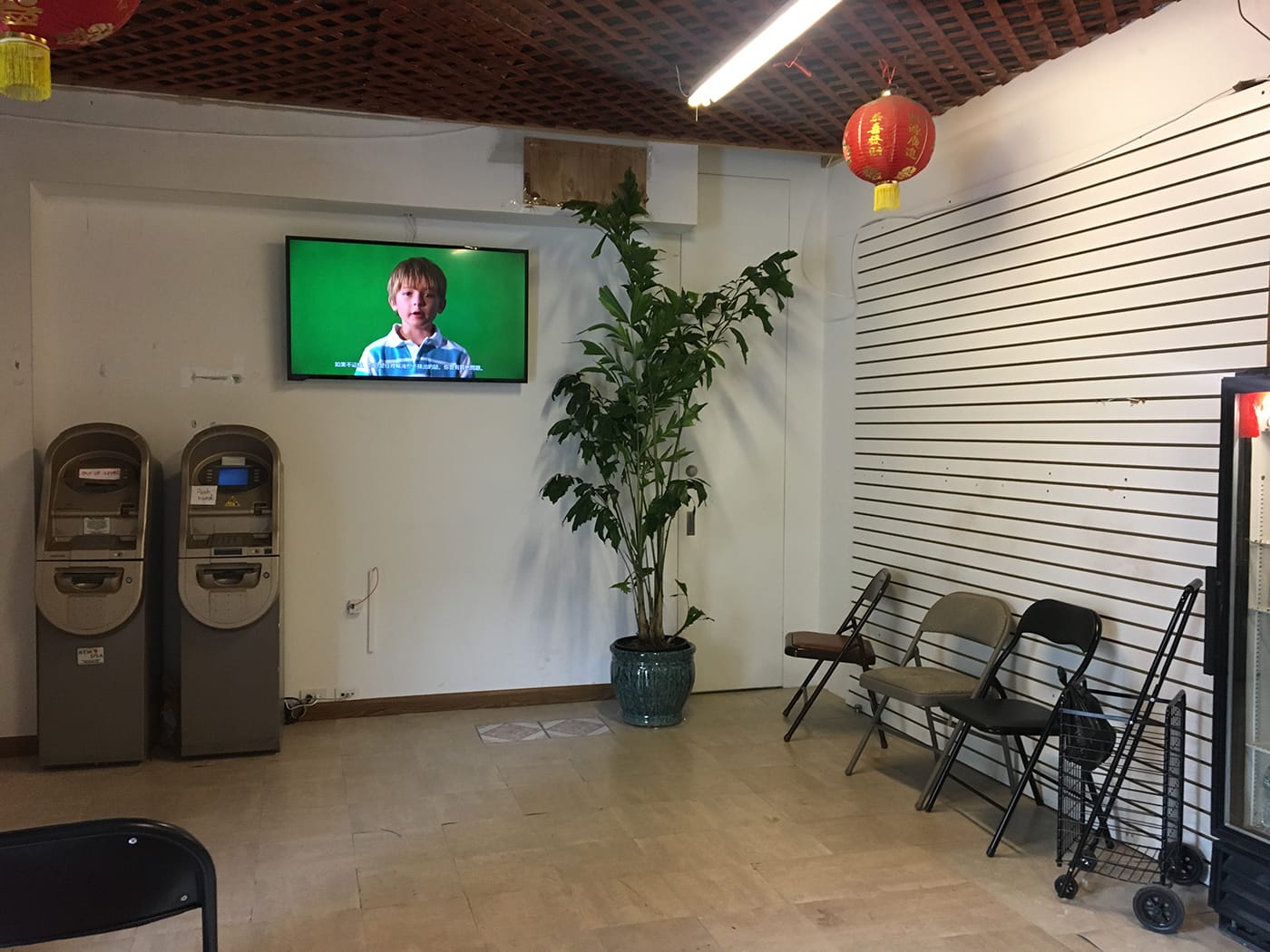 Fast’s vision of an authentic Chinese business begins with an entryway displaying makeshift debris, a damaged awning, and graffiti-defaced walls. The kind of racialized, classist mockery implicit in such a conflation of Chineseness with destitution continues inside the gallery, which features defunct ATMs taped over with makeshift “Out of Order” signs, overflowing trash bins, and a broken patchwork of a floor. In place of a receptionist’s desk, a glass vitrine displays an unappealing array of cheap cell-phone cases. Exactly what Chinatown business inspired this dilapidated space? Certainly not the fish market that previously occupied the address, nor any of the other neighboring restaurants, bakeries, and shops, which all have legible awnings and clean storefronts. Not a single one of the bus stations dotting East Broadway, which consist of waiting rooms with working ATMs and continuous industrial flooring. The exhibition space does not reflect my own personal experiences living with generations of Chinese people or living in New York’s Chinatown.