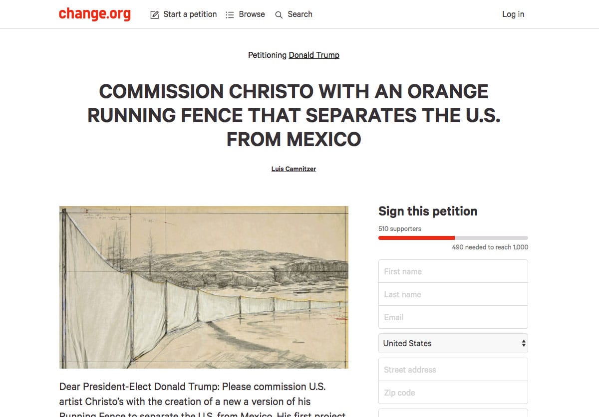 “Please commission U.S. artist Christo’s [sic] with the creation of a new a version of his Running Fence to separate the U.S. from Mexico,” writes Camnitzer, who is Uruguayan, in the petition. “[I]t would transform a racist project into a public art event, and help improve the image of the U.S. with a cultural veneer.”
