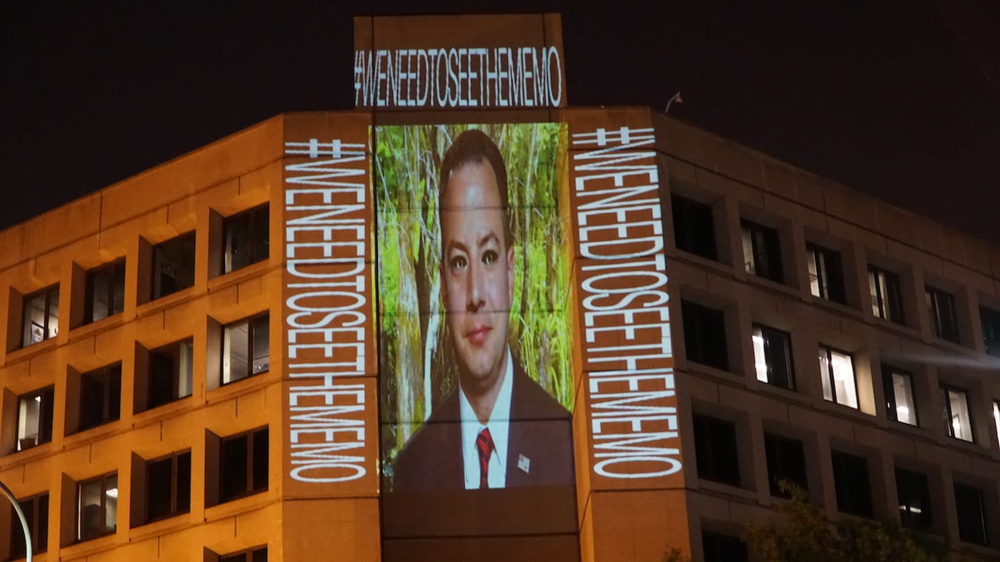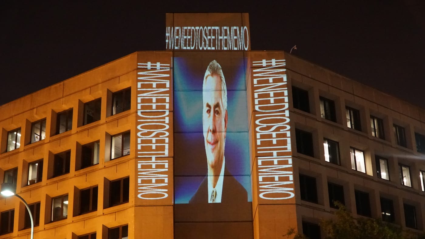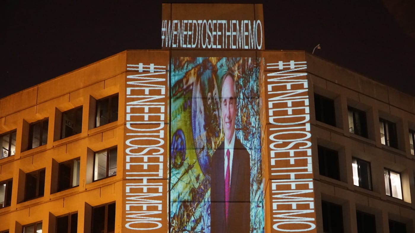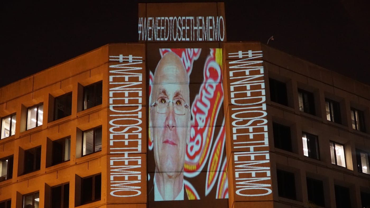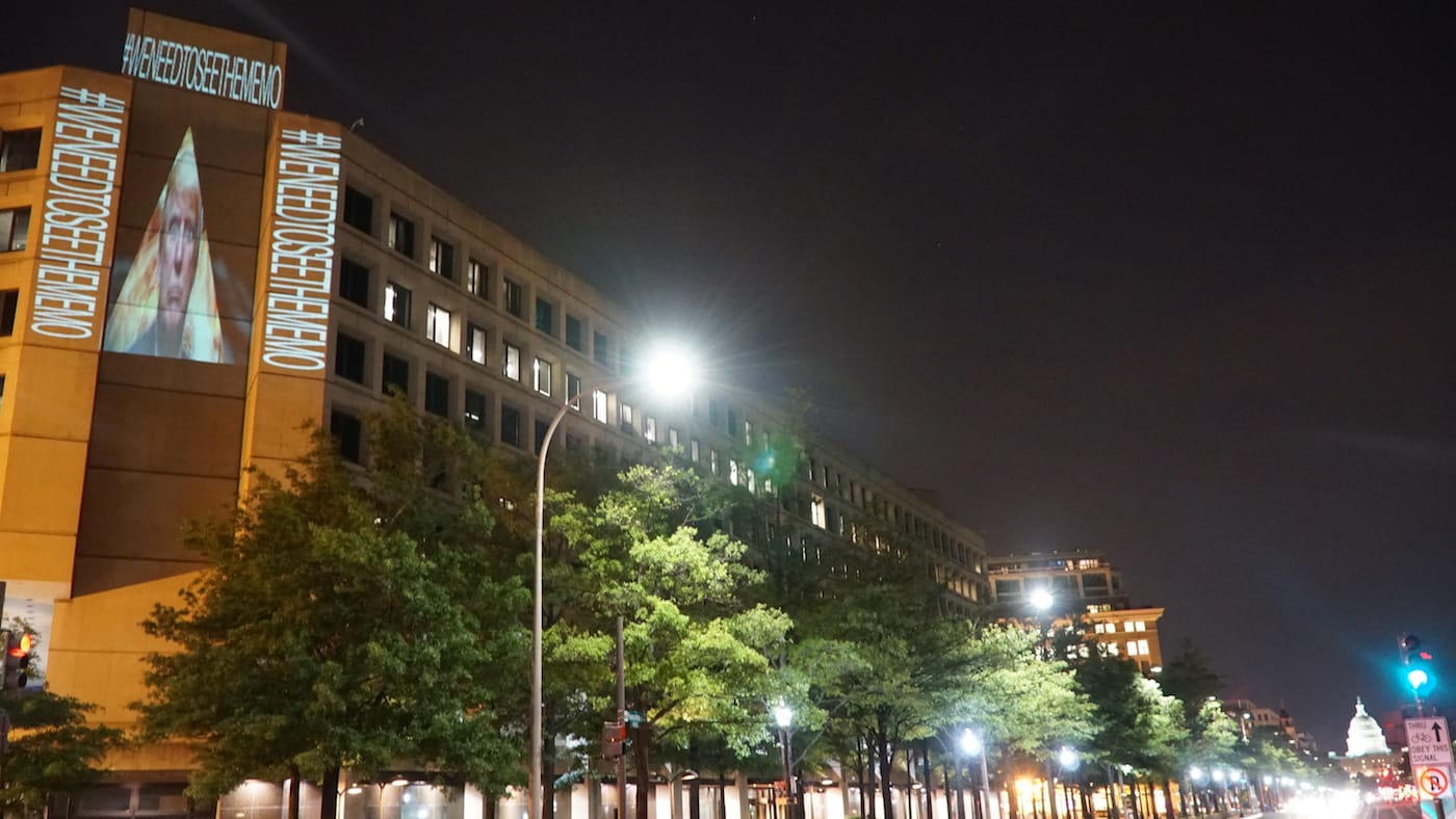 This time, Bell focused on the investigations into the White House’s Russia connections and the recent firing of FBI Director James Comey, projecting such phrases as “#RefusaltoRecuse” and “#WeNeedToSeeTheMemo.” The former refers to allegations that Sessions may have broken his pledge to recuse himself from matters related to Russia; the latter, to a document written by Comey that records a discussion with Trump about former National Security Advisor Michael Flynn.