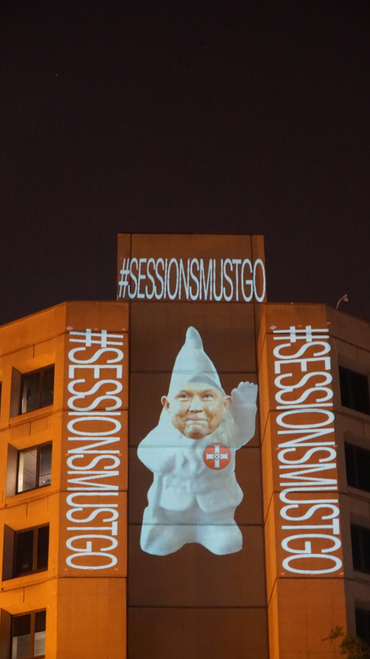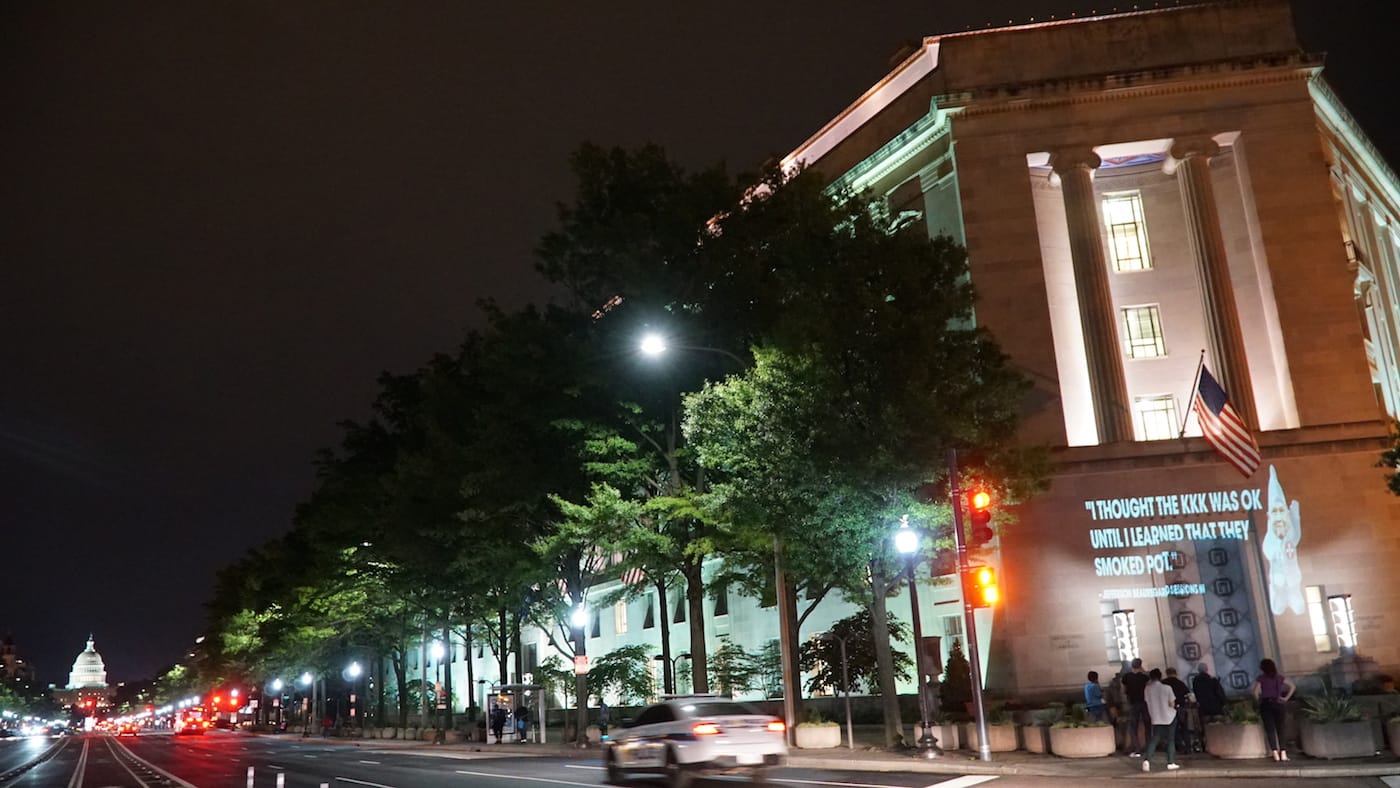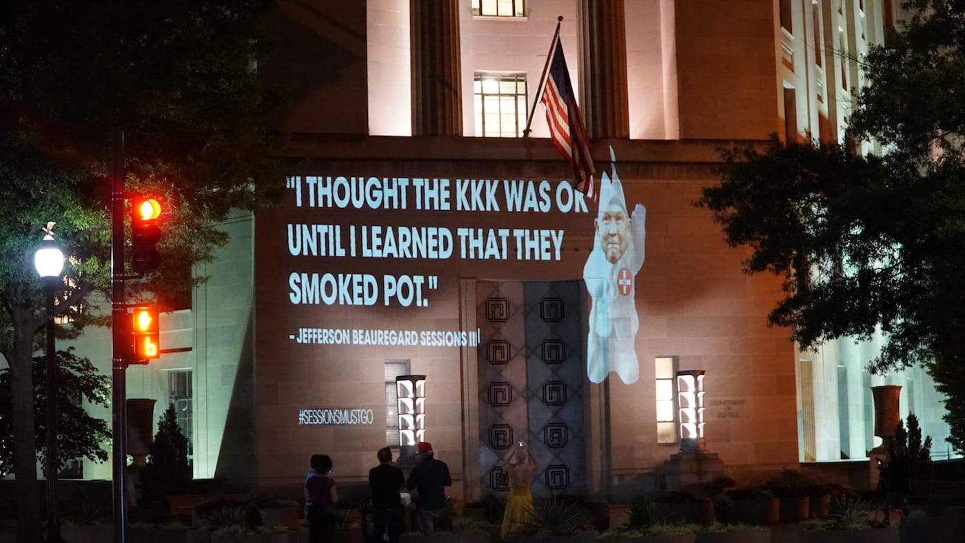 An image of Jeff Sessions dressed as a member of the Ku Klux Klan was one of many projections to light up façades in Washington, DC, late last night. The guerrilla display, which targeted the Department of Justice and FBI buildings, was enacted by local artist and activist Robin Bell, who earlier this week flashed anti-Trump messages referencing the emoluments clause on the nearby Trump International Hotel.