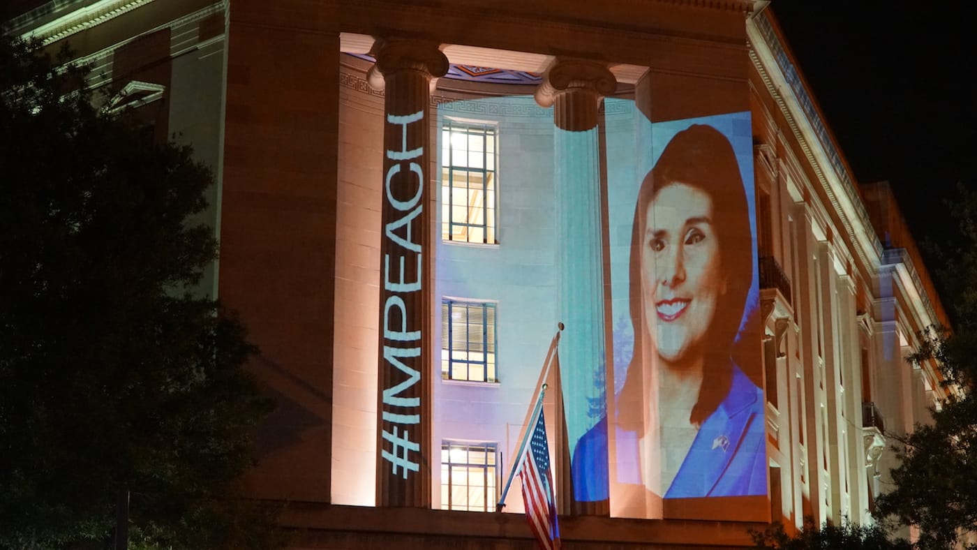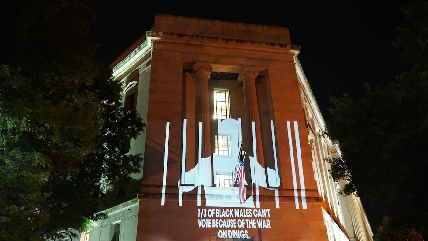 Bell cast his spotlight on other members of Trump’s circle as well, projecting comically sinister portraits of Governor Nikki Haley, EPA head Scott Pruitt, Secretary of State Rex Tillerson, and Trump advisor Linda McMahon, among others. One message that he flashed on the Department of Justice, however, was more sobering: a stark image of a man behind bars, accompanied by the words, “1/3 of black males can’t vote because of the war on drugs.”