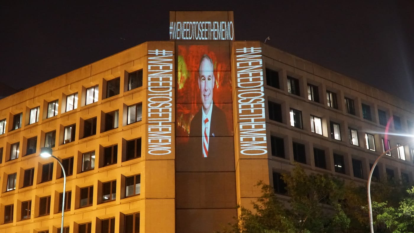 Robin Bell lit up the DOJ and FBI façades with phrases such as "#RefusaltoRecuse" and comically sinister portraits of members of the Trump administration.