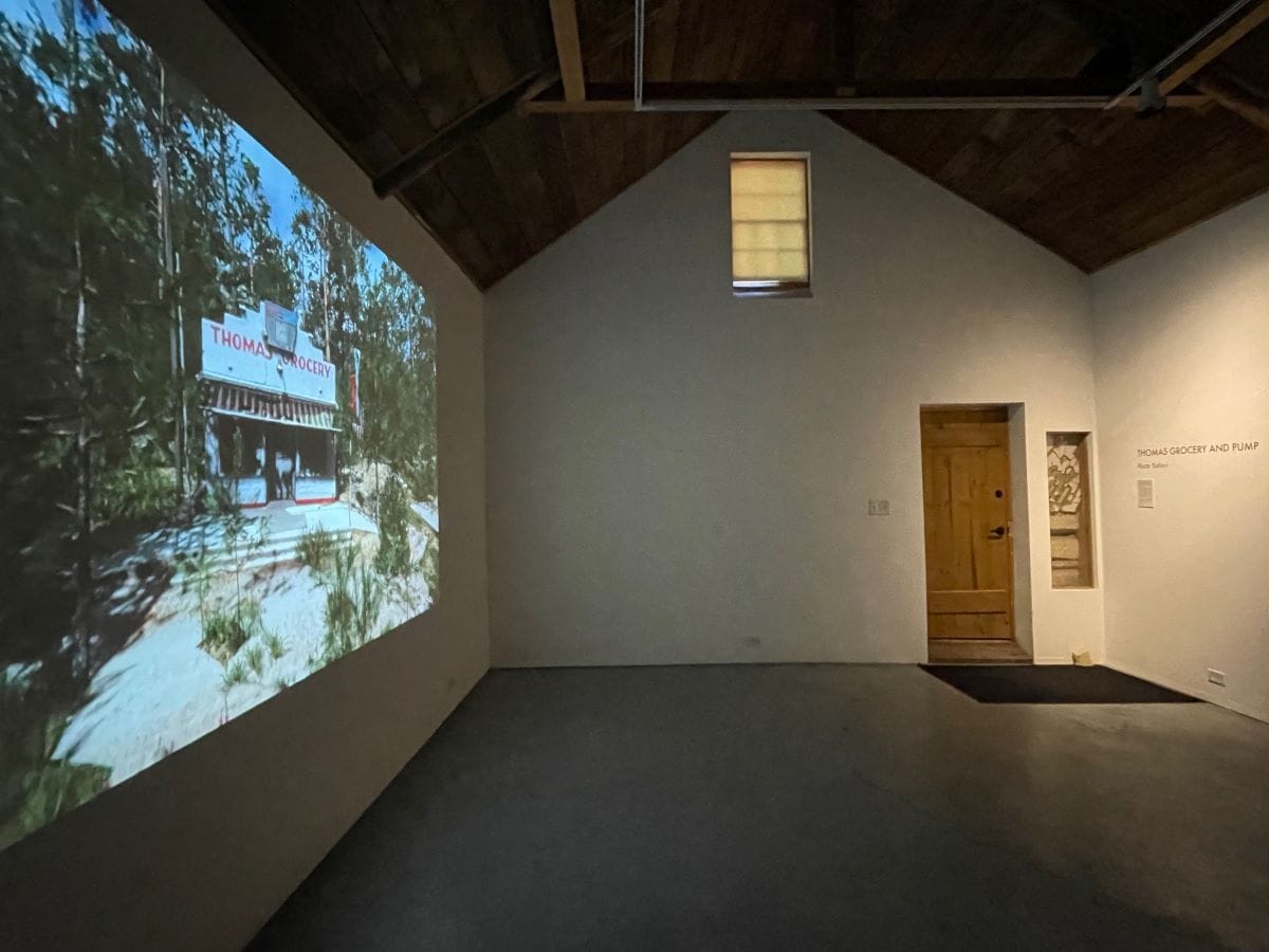 Thomas Grocery and Pump is a video loop projected onto the wall of the CCA Christensen Cabin Gallery at Granary Arts. As the video pans through different angles of the building, “Being Green'” by actor (and Thomas Grocery regular) Wilford Brimley plays on a loop congruently with the video. The tone of the video and swells of emotion coming from the score sweeps through the luscious natural scenery (added by Safavi), allowing viewers peeks at the building.