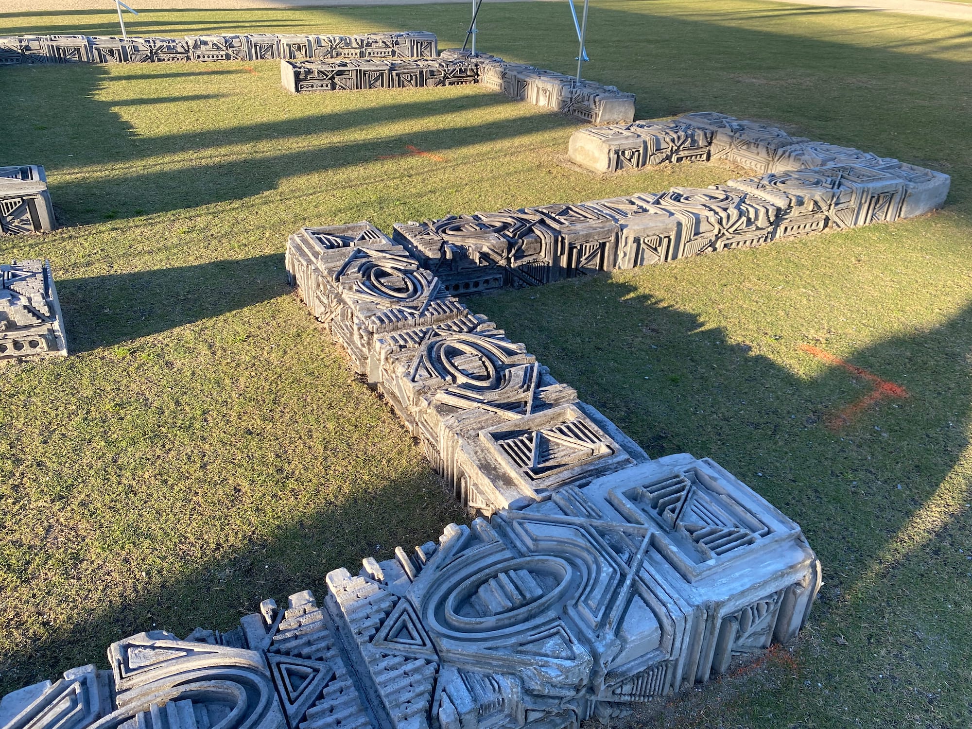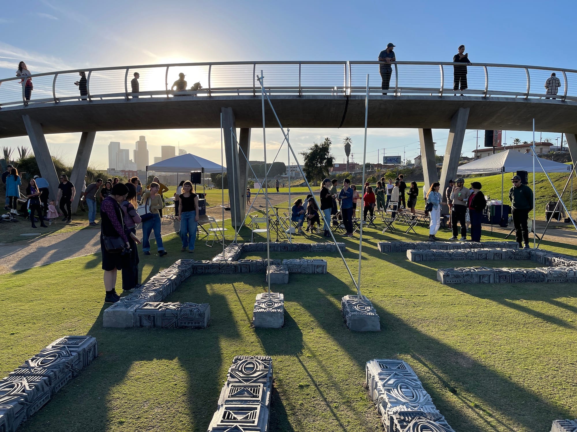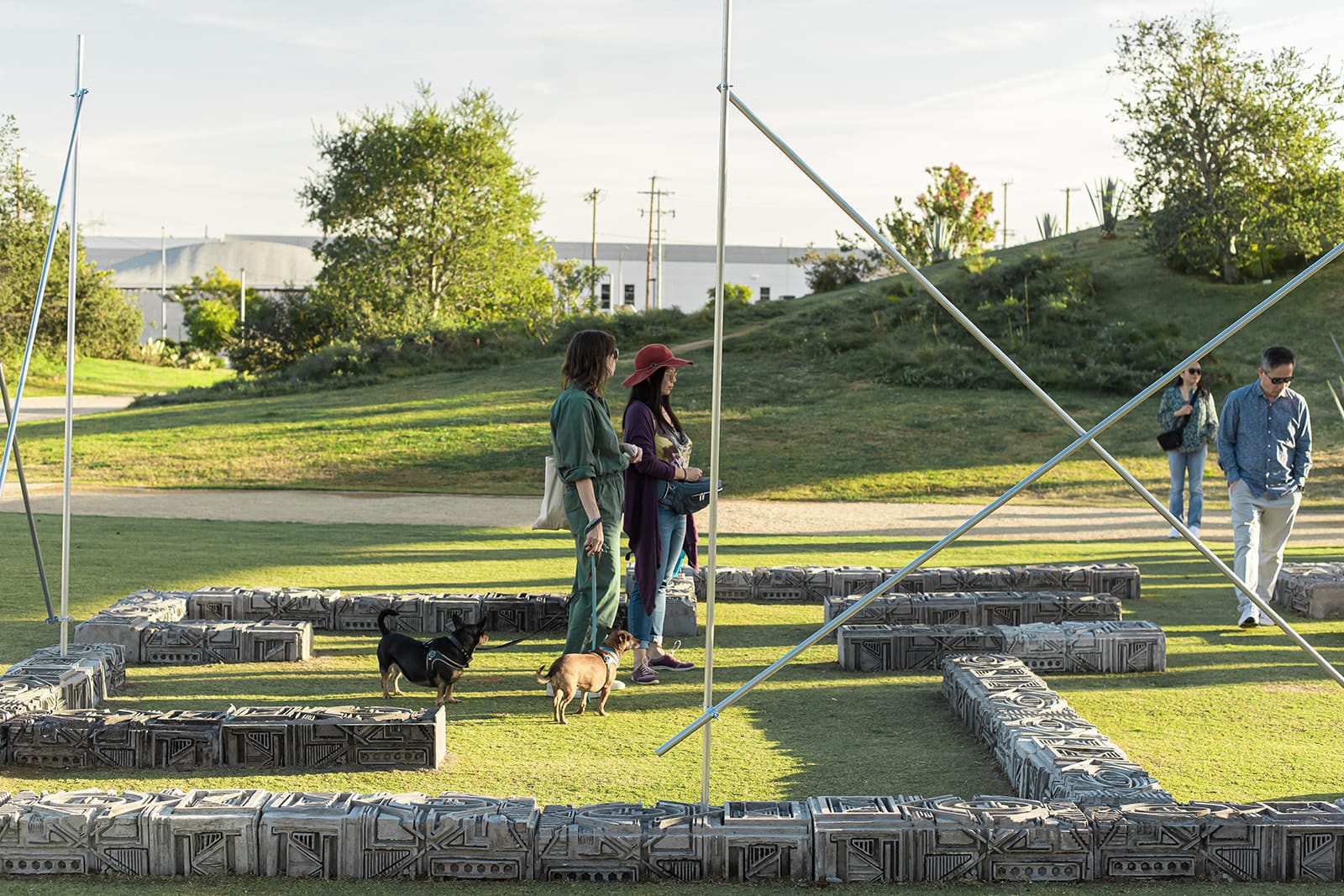 LOS ANGELES — On Saturday afternoon, a crowd gathered at Los Angeles State Historic Park on the edge of Chinatown for the opening of Rodrigo Valenzuela’s new public artwork, commissioned by the local nonprofit Clockshop. Titled “The Underpinning,” the work consists of about 75 large concrete blocks laid out in rows on the grass, resembling the foundations of a newly discovered ancient ruin. The artist adjusted metal poles extending up from the blocks like temporary walls while visitors meandered through its suggested rooms and children scampered over its low ramparts, undeterred by a “No Climbing” sign nearby.