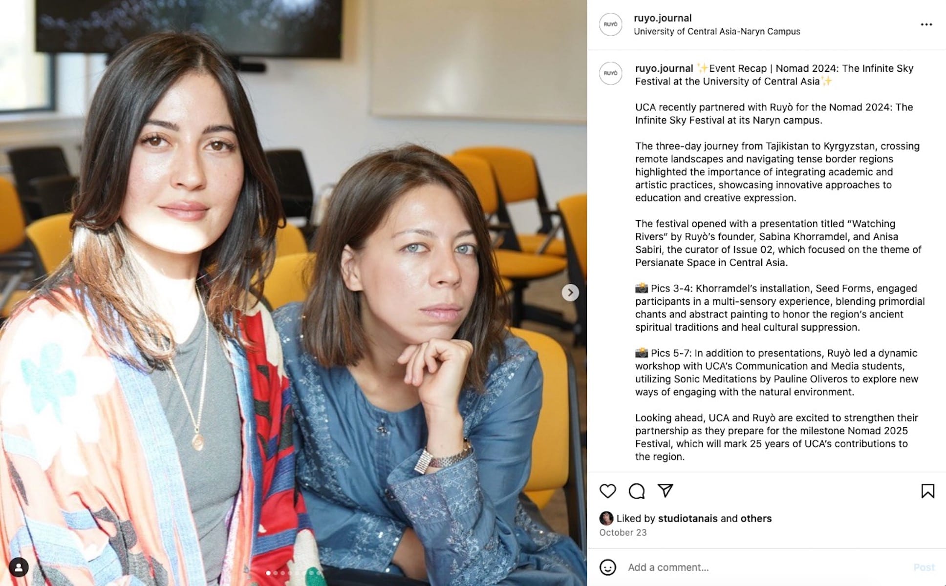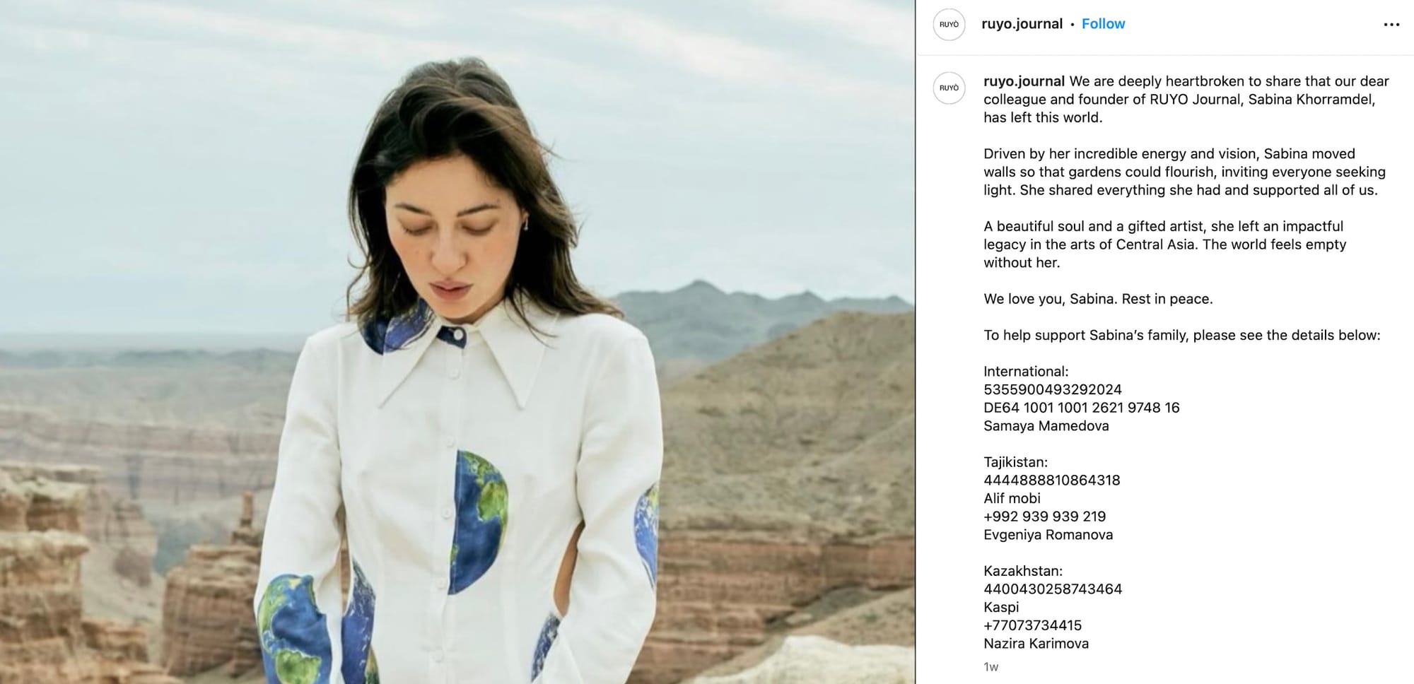 "Driven by her incredible energy and vision, Sabina moved walls so that gardens could flourish, inviting everyone seeking light," her colleagues at Ruyò Journal wrote in a statement announcing her death shared on Instagram. "She shared everything she had and supported all of us. "A beautiful soul and a gifted artist, she left an impactful legacy in the arts of Central Asia. The world feels empty without her."