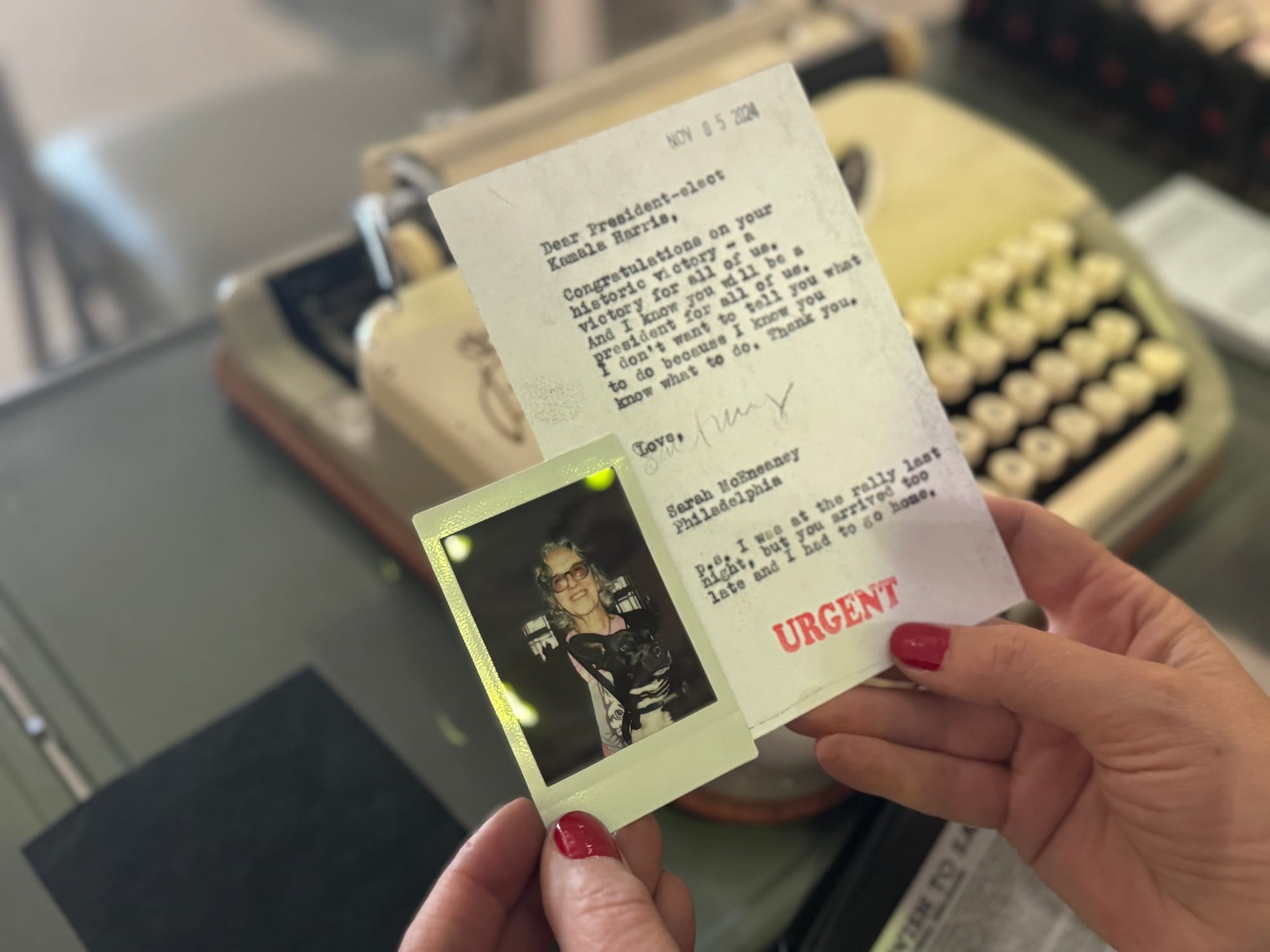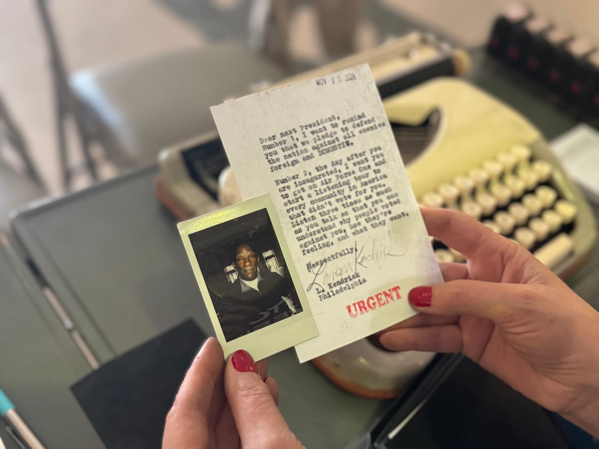 Bill Rhoda, co-owner of Philly Typewriter, lent typewriters to Oring and restored her personal collection to use in this year’s performance tour, writing his own postcard calling for the next president to “lead with kindness.”
