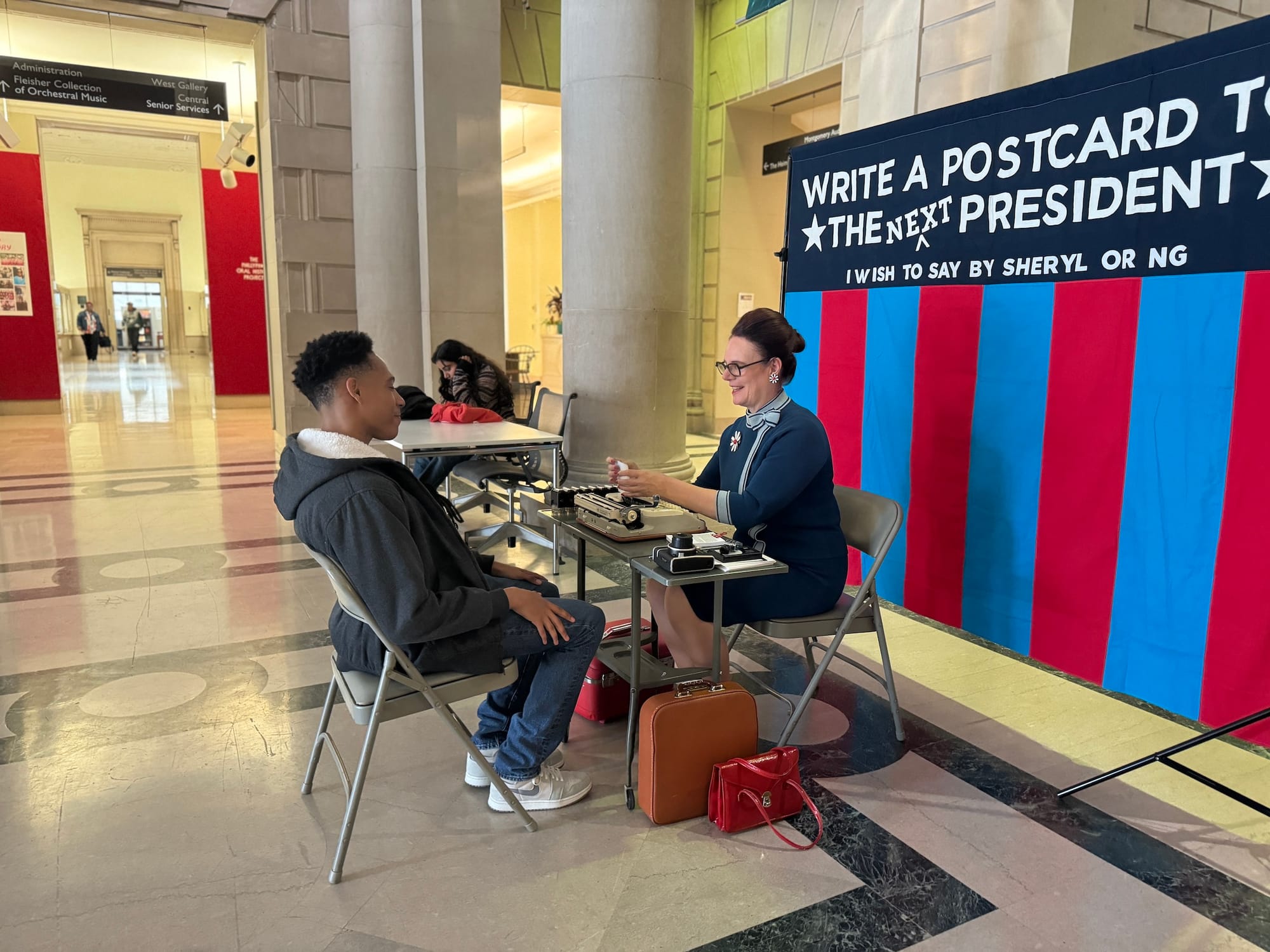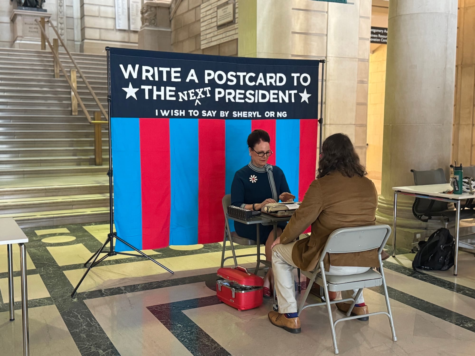 Performance artist Sheryl Oring pulled out her 1960s secretarial uniform and typewriter this morning, November 5, to compose hundreds of postcards in public — just as she has every Election Day since 2004, when former President George W. Bush defeated John Kerry in his second bid for the White House.