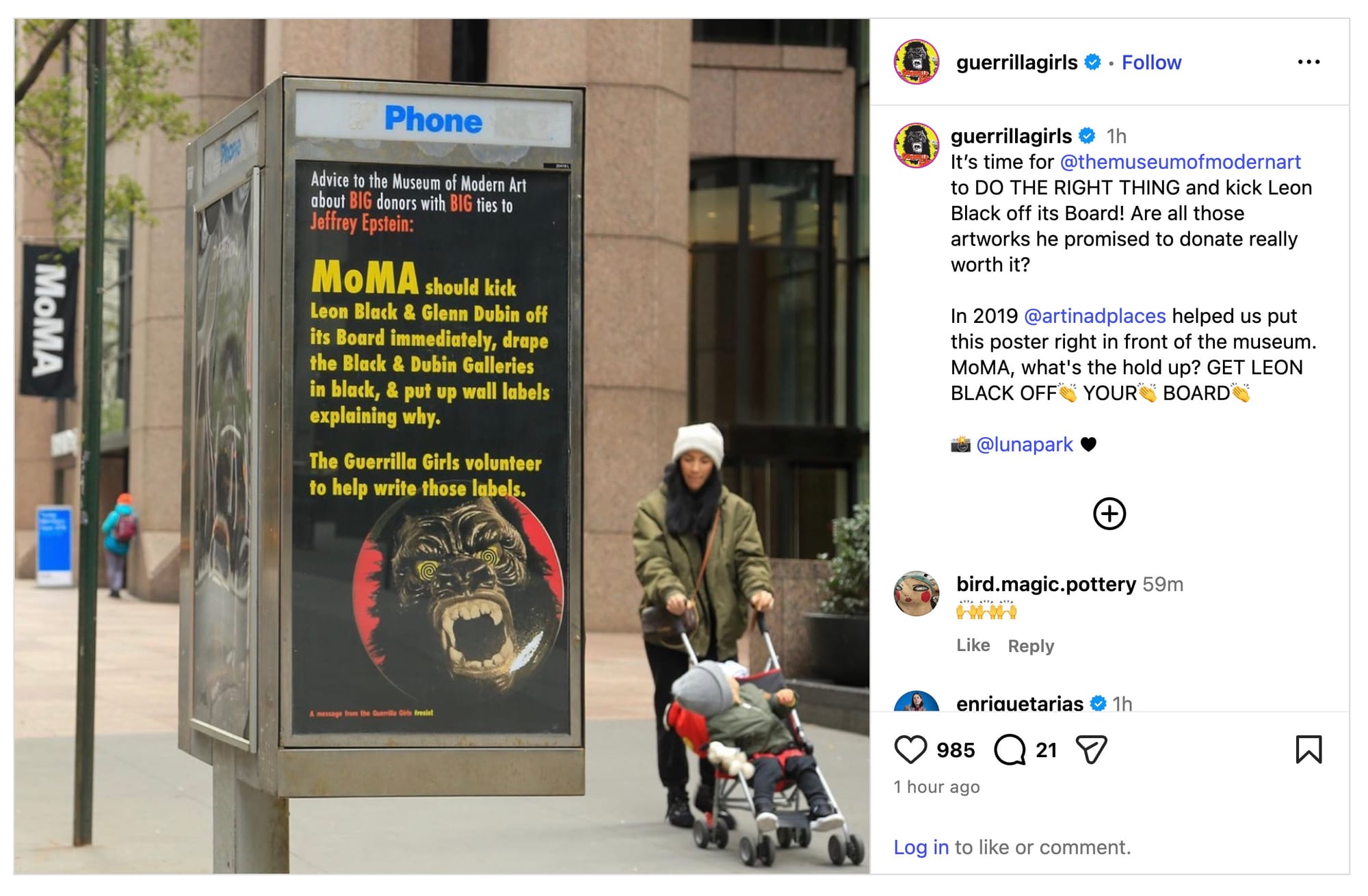 “It’s time for @themuseumofmodernart to DO THE RIGHT THING and kick Leon Black off its Board!” the group wrote. “Are all those artworks he promised to donate really worth it?”