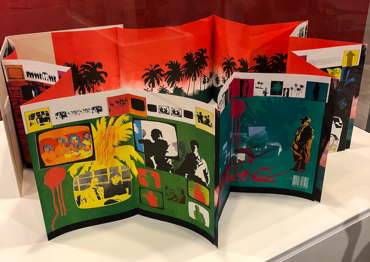 The exhibition includes several works from Latin America, where there is a robust history of publishing as a subversive tool against authoritarian regimes. Mexican artist Felipe Ehrenberg fled his home country for England in the wake of the political unrest of 1968. “[A] very close friend of ours had been arrested and sentenced to 14 years in jail for having used a mimeograph in Mexico, allegedly ‘for subversive reasons,'” he recalled, “so for me, it was a very dangerous tool.” His contribution is “Codex Aeroscriptus Ehrenbergenesis” (1990), a fold-out frieze of hand-cut stenciled images. Vibrant images of skulls, cowboys, palm trees, and TV sets are juxtaposed in an enigmatic pictorial narrative that recalls pre-Hispanic codices. Argentine artist Leandro Katz also digs into the history of the region with his 1971 set of lithographs that reproduces the letter “ñ” in various colors. While the ñ is unique to the Spanish alphabet, most words that begin with that letter come from one of several indigenous languages. By focusing on a ubiquitous and overlooked facet of language,“Ñ” tells the story of Spanish conquest of the New World.