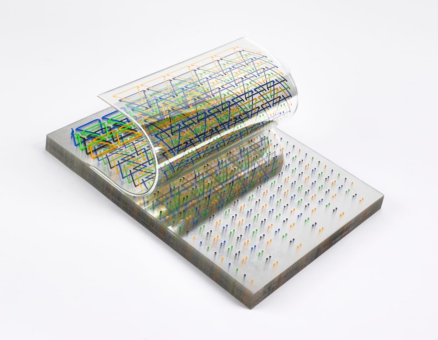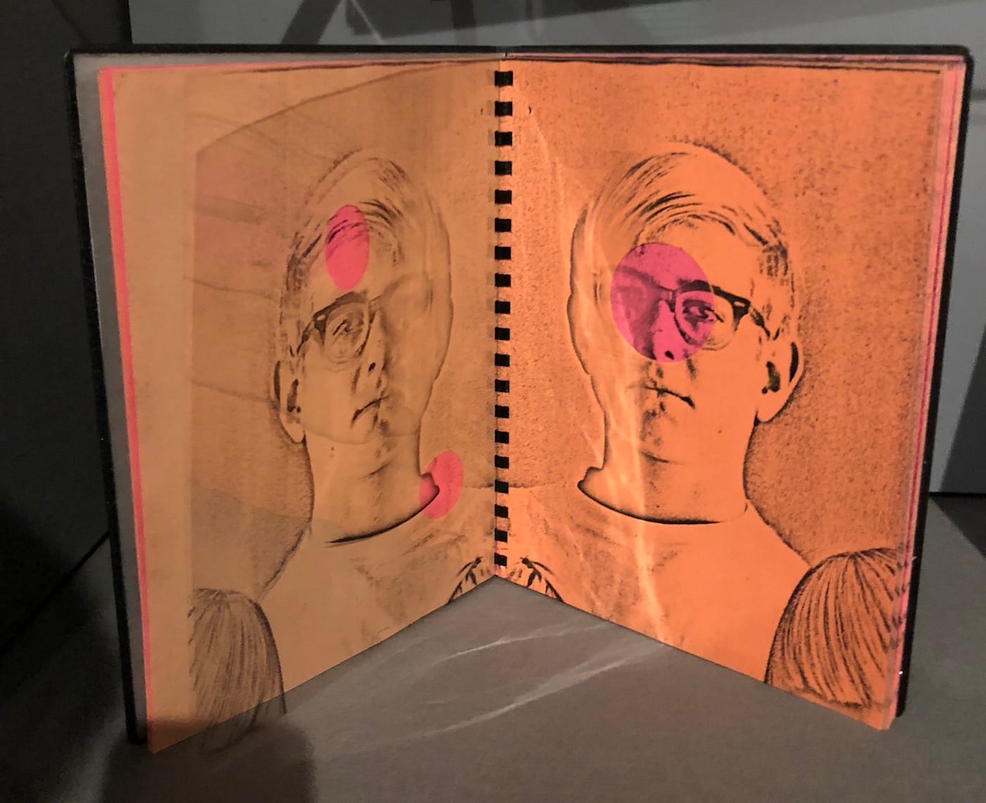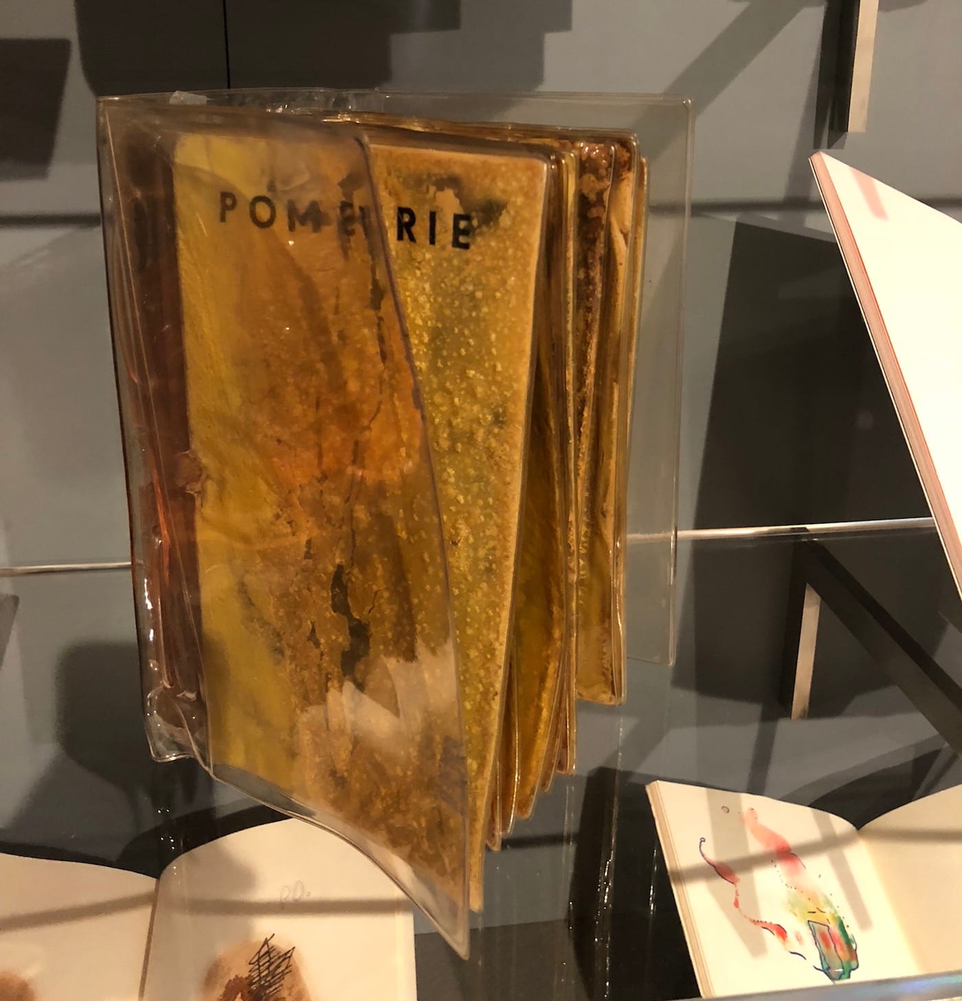 Other than that fact, the show lacks a sense of coherence, opting instead for a heterogeneous sampling as opposed to a narrowly focused thesis. Several examples explore the material properties of the book as art object, such as Tauba Auerbach’s “Stab/Ghost” (2013), a mesmerizing stack of clear sheets of Lexan, onto which colorful shapes have been silk-screened. A plexiglas cover bends back on itself in an acrobatic curve. Olafur Eliasson’s contribution “Your House” (2006) is a laser-cut 3D rendering of the artist’s home, a dollhouse assembled one page at a time. Turn the pages to tour the house. It is a coldly technical feat, devoid of intimacy. On the opposite end of the spectrum is a series of books by Dieter Roth that revels in abject humor. One book incorporates painted bagels while another makes sausage from ground-up books. The centerpiece is “Poemetrie” (1968) whose urine-soaked pages continue to yellow and ferment over time.