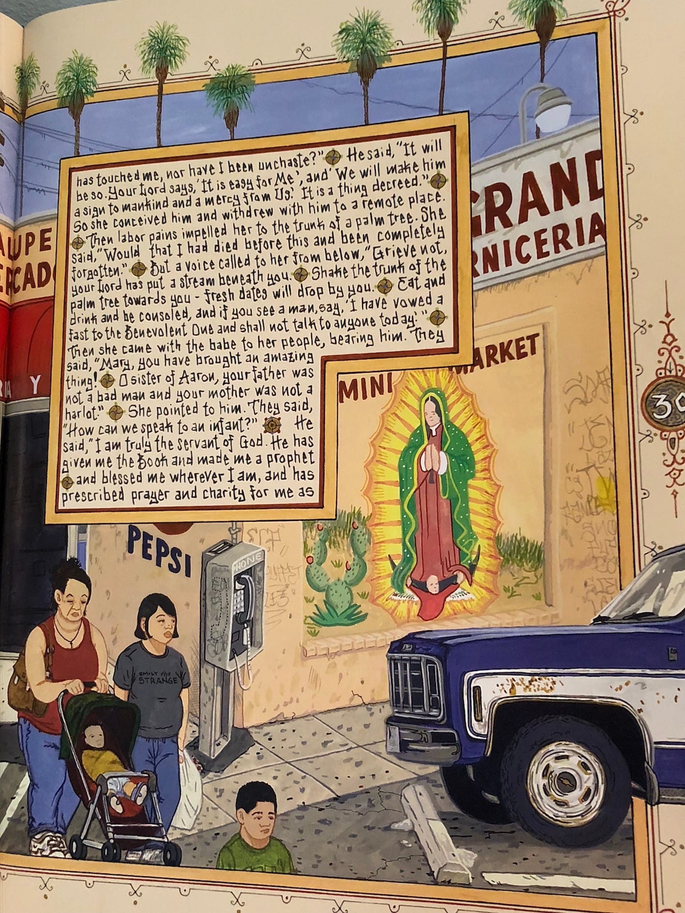 Sandow Birk’s book is the most traditional in format, but offers a radical take on a sacred text. His “American Qur’an” (2005–2014) is a lavishly illustrated English translation of the Muslim holy book. In the space between central blocks of text and ornate, decorative borders, Birk has painted a wide-ranging selection of American scenes: downtown Manhattan seen from above, surfers with their boards, corner mini-markets with Virgen de Guadalupe murals.