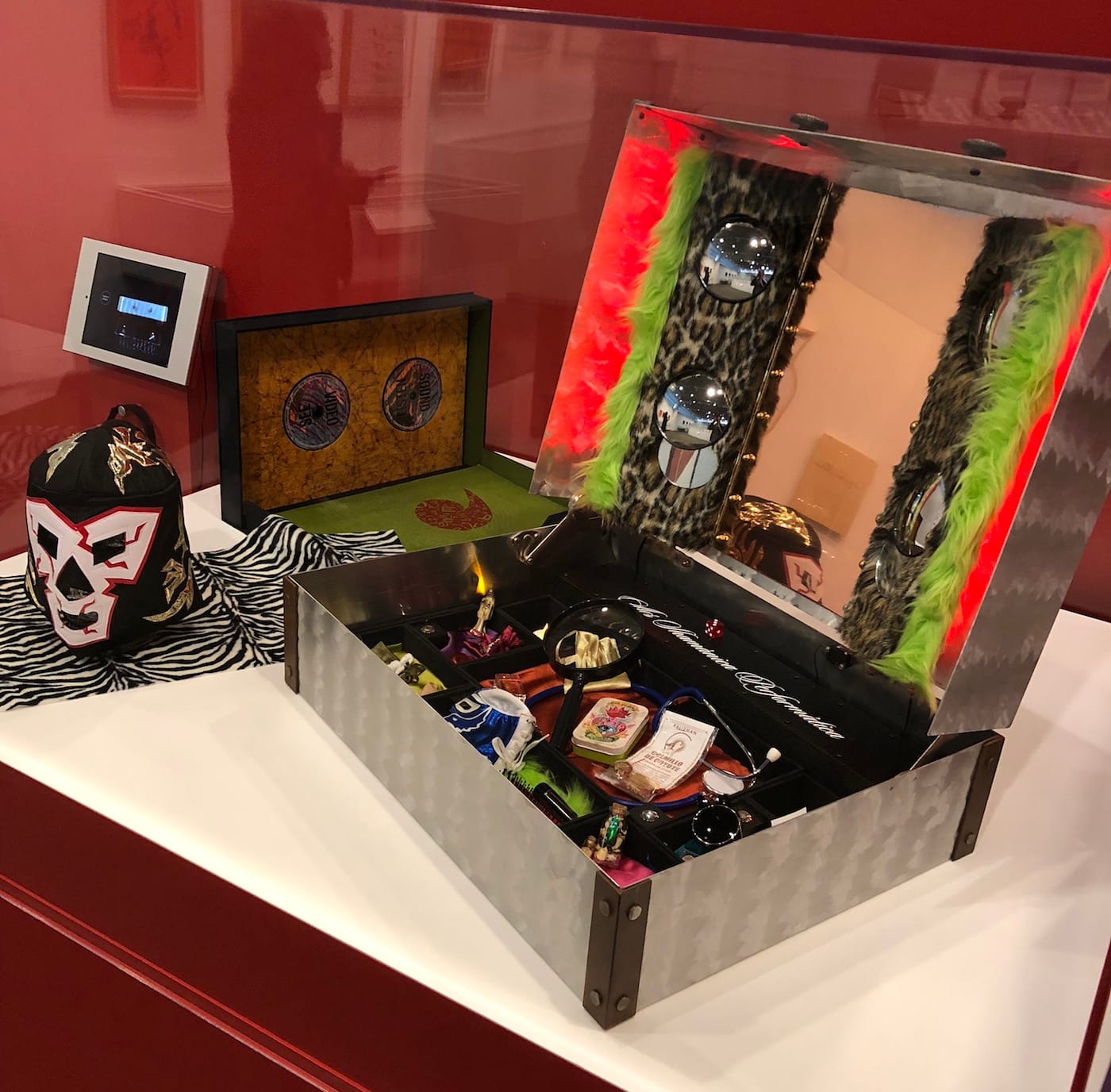 Mexico City–born artist and performer Guillermo Gómez-Peña’s and Felicia Rice’s “DOC/UNDOC: Documentado/Undocumentado” (2014) is an aluminum box lined with faux leopard and zebra fur, filled with various items that explore the immigrant experience, including an illustrated fold-out book, a lucha libre mask, and clips of sound art. Although it may bear some resemblance to Duchamp’s “Boîte en Valise” — the original “art box” filled with miniature versions of his works — it also recalls the baroque kitsch of Mexican altars.