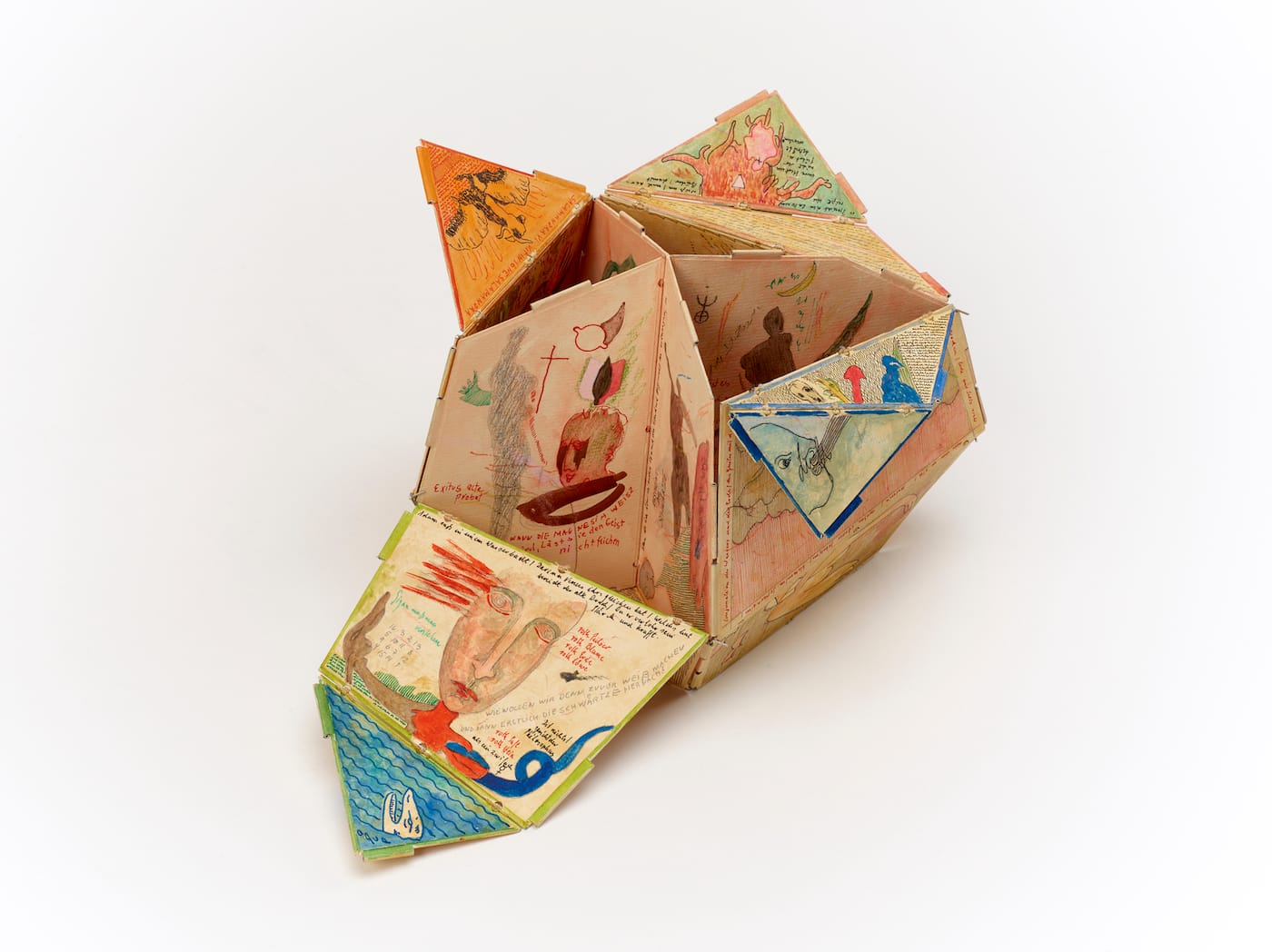 An exhibition at the Getty Research Institute, Artists and their Books / Books and Their Artists, does not answer this question, but rather further complicates it, illustrating the myriad ways that contemporary artists have pushed the boundaries and definitions of the book. The over 40 examples culled from the GRI’s Special Collections do not limit themselves to printed and bound pages. Instead, they break free from their bindings, reconfiguring themselves into cityscapes like Johanna Drucker’s “Bookscapes” (1986–88), or folding into a puzzle box, like “The Philosopher’s Stone“ (1992) by Barbara Fahrner and Daniel E. Kelm. Some unfurl with an accordion fold, while others hang on the wall like a suite of prints. The one thing they all have in common is that these books don’t illustrate other works of art; they are works of art.