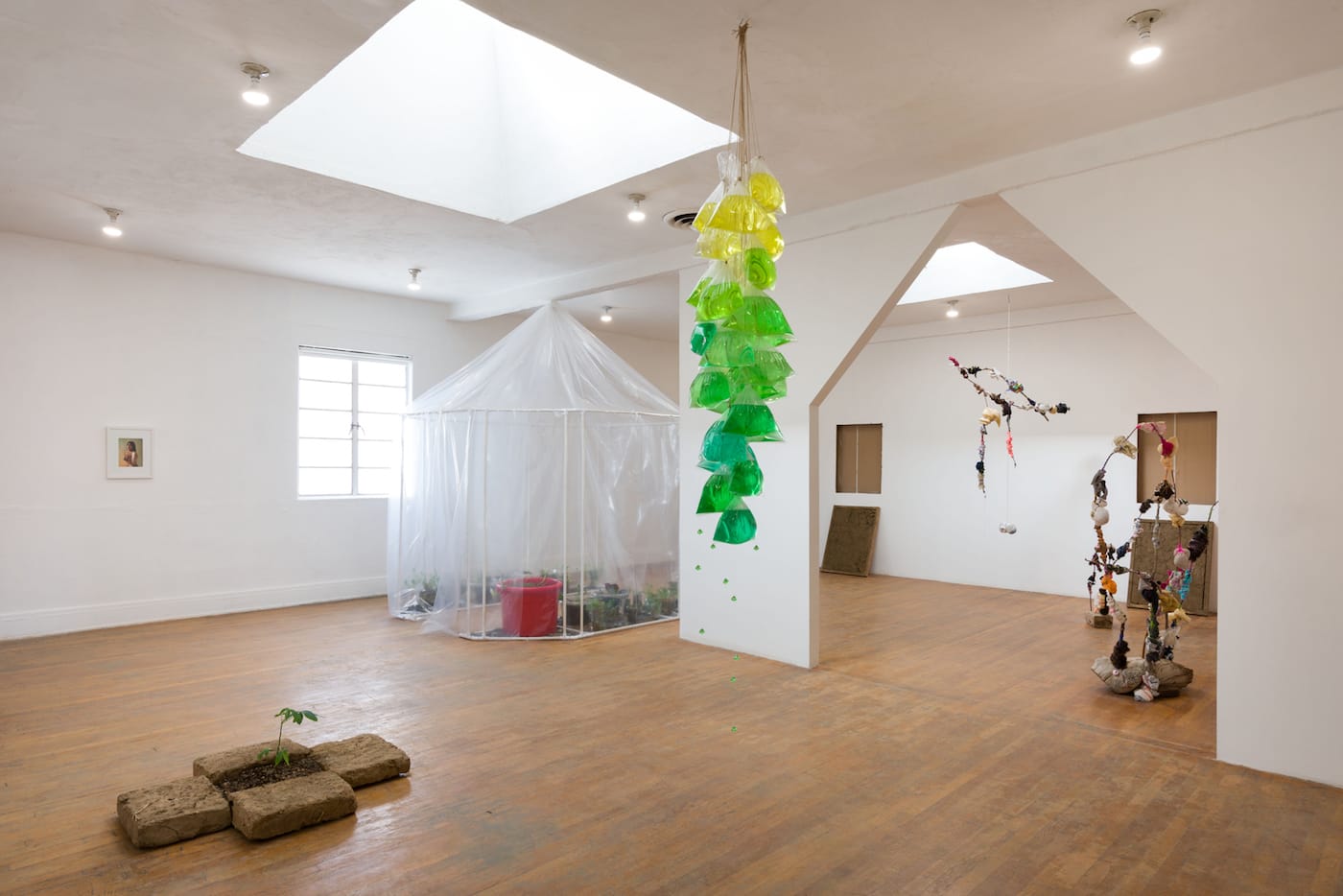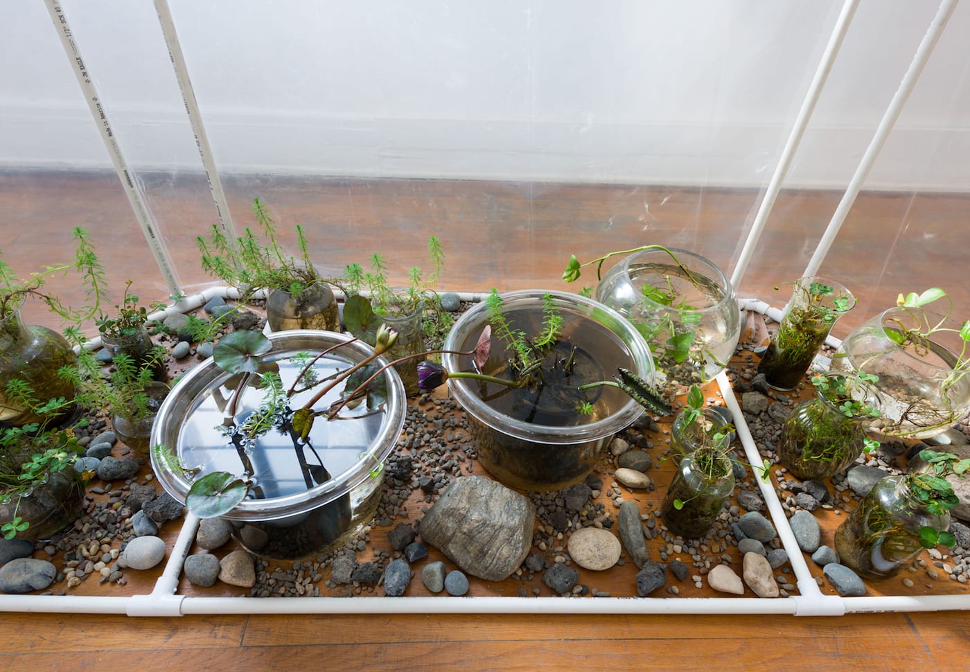LOS ANGELES — There are flowers growing at Pasado mañana, Beatriz Cortez and Rafa Esparza’s exhibition currently on view at Commonwealth and Council. Water lilies in red buckets reach for the ceiling of a plastic-encased, makeshift greenhouse; pothos in planters spread their leaves along a wall; succulents and red cactus buds sprout from a cardboard Coca-Cola box that itself appears to grow downward from the ceiling and from which strings of old photographs dangle. Next to the cacti is an old phone that looks, and feels, mummified. Something about this particular piece reminds me of a reliquary, but also of a time capsule, constructed as much for the memories as for its eventuate rediscovery by a future civilization.