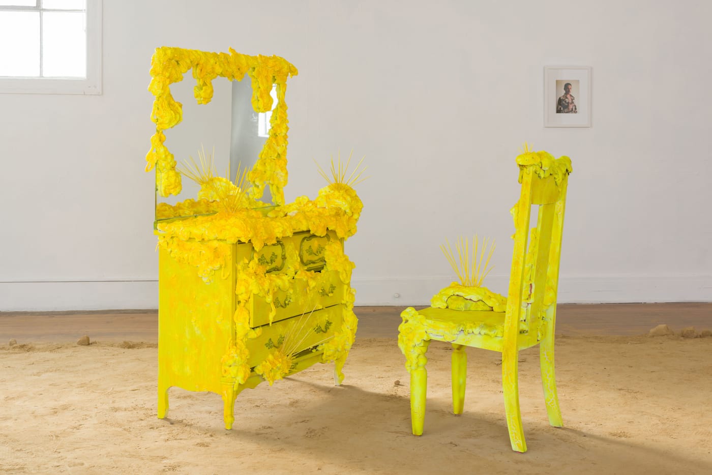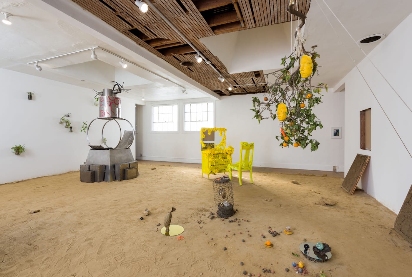 And so Cortez’s “The Argonaut: after Pakal” (2018) speaks to what comes later. The steel structure, which nearly scrapes the ceiling, is a kind of spaceship (a common motif in her work), and it seems to come from the same future imagined by the water lilies. Maea’s “From ancient matter, she takes form” (2018), an altar made of plants, branches, mirrors, and crystals, feels both futuristic and ancient — not only in its aesthetic, but in the ideas it evokes about construction and labor, and who’s doing the building or praying. One might be viewing an archaeological site, or impressions left by the beings inhabiting Cortez’s spaceship, but sacred work was undertaken here.