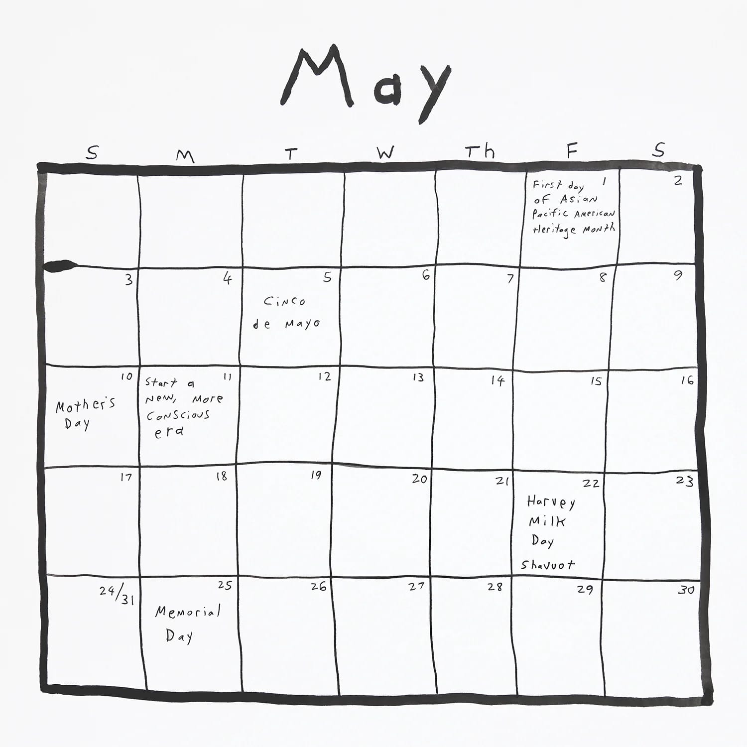 The pieces’ loose lines and selective imprecision are complemented by made-up “holidays” scribbled into days on the calendar: “Rethink your cherished stereotypes,” one reads. Many of these holidays have persisted throughout the decades since the calendar’s inception in 1985, where both the messages and the medium itself testify to the mundane absurdity of the passage of time.