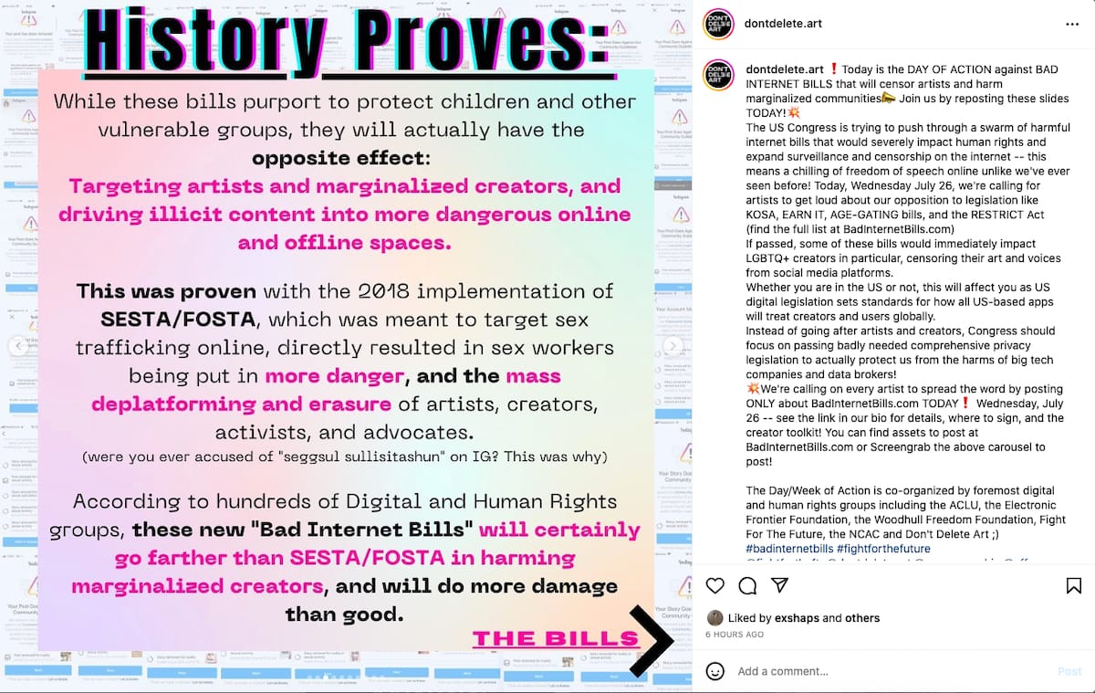 "While the US government is not explicitly directing websites and platforms to erase and censor art in these bills, we know that legislation like this directly results in the chilling of freedom of expression online — something we witnessed after the passing of SESTA-FOSTA," the DDA spokesperson said.