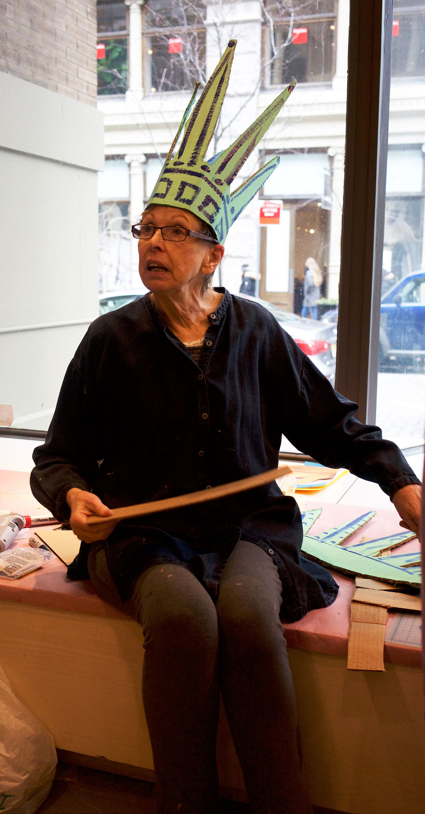 The pair called an initial meeting at the Howard Hotel in Soho just four days after the election, and 16 people attended, among them artists Heide Fasnacht, Nancy Davidson, Greg Drasler, Janet Goldner, Ann Agee, and Julia Kunin, plus a number of writers. They chose their group name and the Statue of Liberty theme in the hopes of addressing as wide a range of threatened freedoms — women’s rights, immigration, health care, and free press — as possible. That night they created a Facebook page, and by the next morning hundreds had joined. Subsequently, they’ve held meetings in spaces that can accommodate their size, mainly in various buildings of the School of Visual Arts. They’ve also been using an empty storefront in Soho for their mammoth work sessions, attracting many women artists of a variety of ages, and some men, to churn out hundreds of Lady Liberty–inspired costumes and signage.
