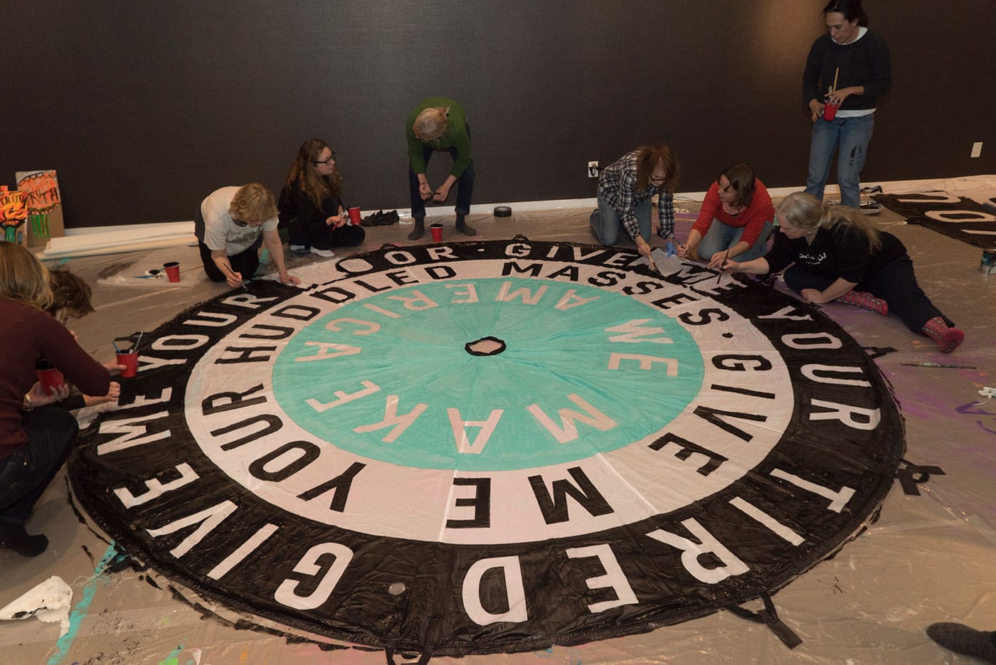“I think we have to make a lot of noise and fight the results of this election, which are really infuriating,” said L.C. Armstrong, who was taking time away from preparing for her upcoming show at Marlborough Gallery. While painting text on one of the parachutes, she confessed to working as a sign painter to put herself through school. “I hate marches and I hate crowds, but I am going to march in Washington,” she said. Armstrong was joined by artists Sandi Slone and Lisa Hoke across the 12-foot circle. “This is a chance for us to get together and make ourselves heard about all the issues — not only about the liberation of half of the human race, but about all the freedoms that are being threatened right now,” said Slone. “I think there’s a real urgency this time,” added Kozloff. “We are facing really scary stuff, and everybody wants to participate rather than stay home and be depressed by themselves.”
