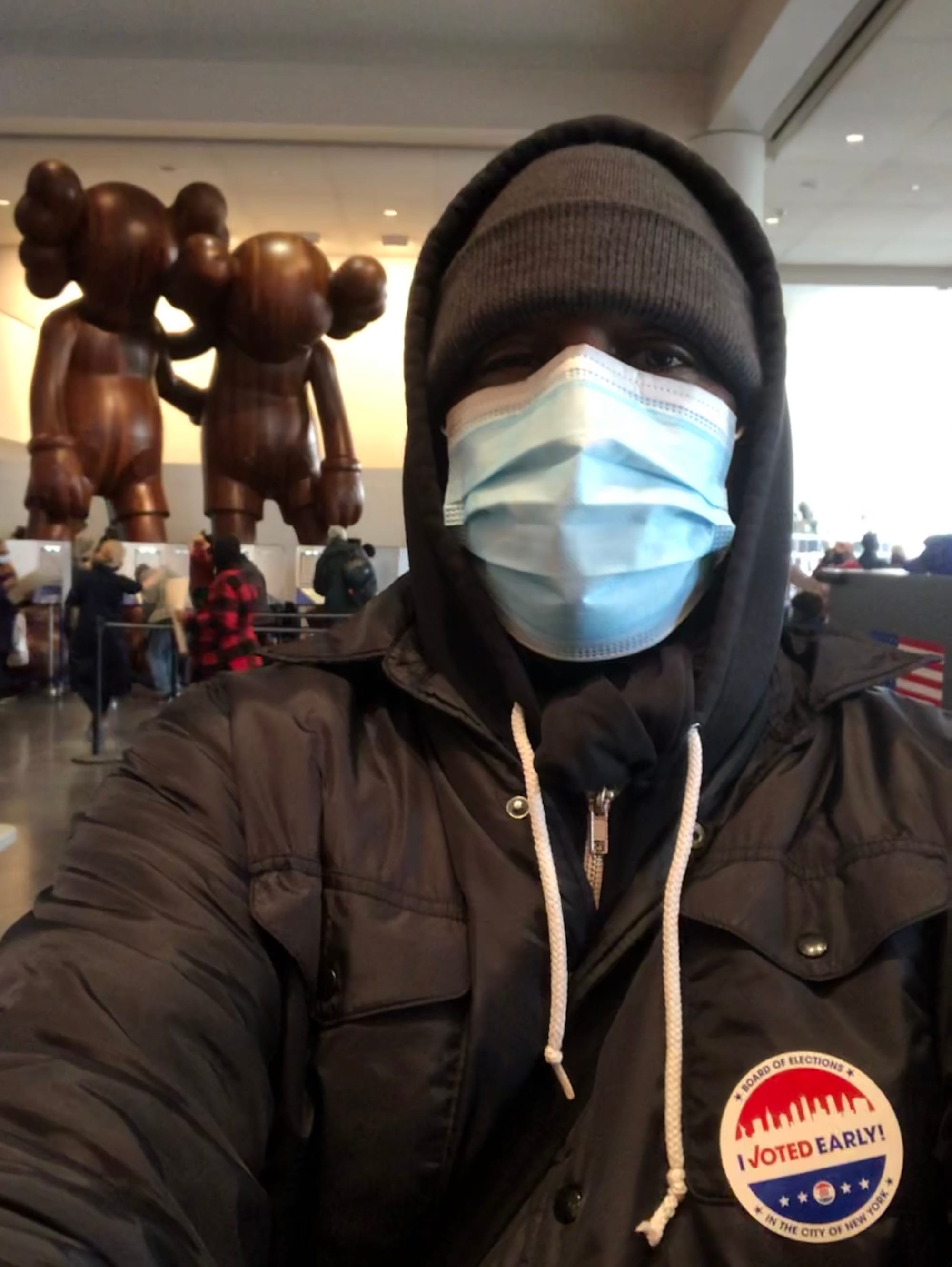 Present: Brooklyn Museum shadows, long, east to west, testing all three layers, mask and hoodie. One week before Election Day, I reflected upon the 20,000 enslaved Africans in New York in 1776 when Washington retreated; the 20% of the colonial and post-colonial population that was enslaved; and the 20% of Washington’s army that was African in 1781, when the war was won. Our flawed first president peacefully transferred power. This free African waited three hours leaning on Wheatley’s shoulders to ensure one more.