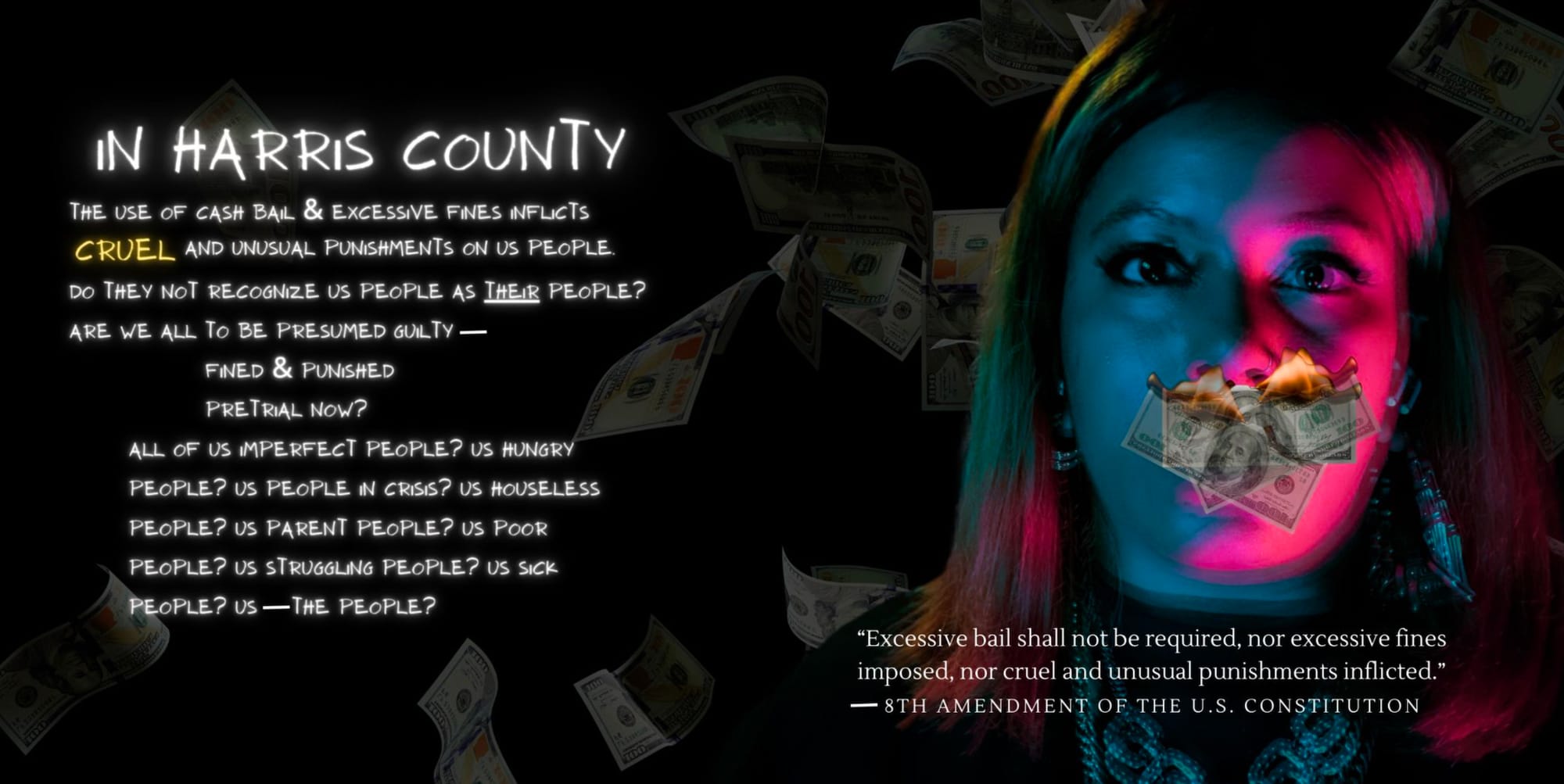 Fraylita Hicks, a poet and visual artist who was commissioned to create an image for 8 x 5 Houston, had created a work featuring a self-portrait and two texts. One urges the viewer to consider the humanity of incarcerated people. The other includes a quote from the Eighth Amendment of the United States Constitution, which outlaws "excessive bail." The photograph shows them outside of the apartment where they were arrested.
