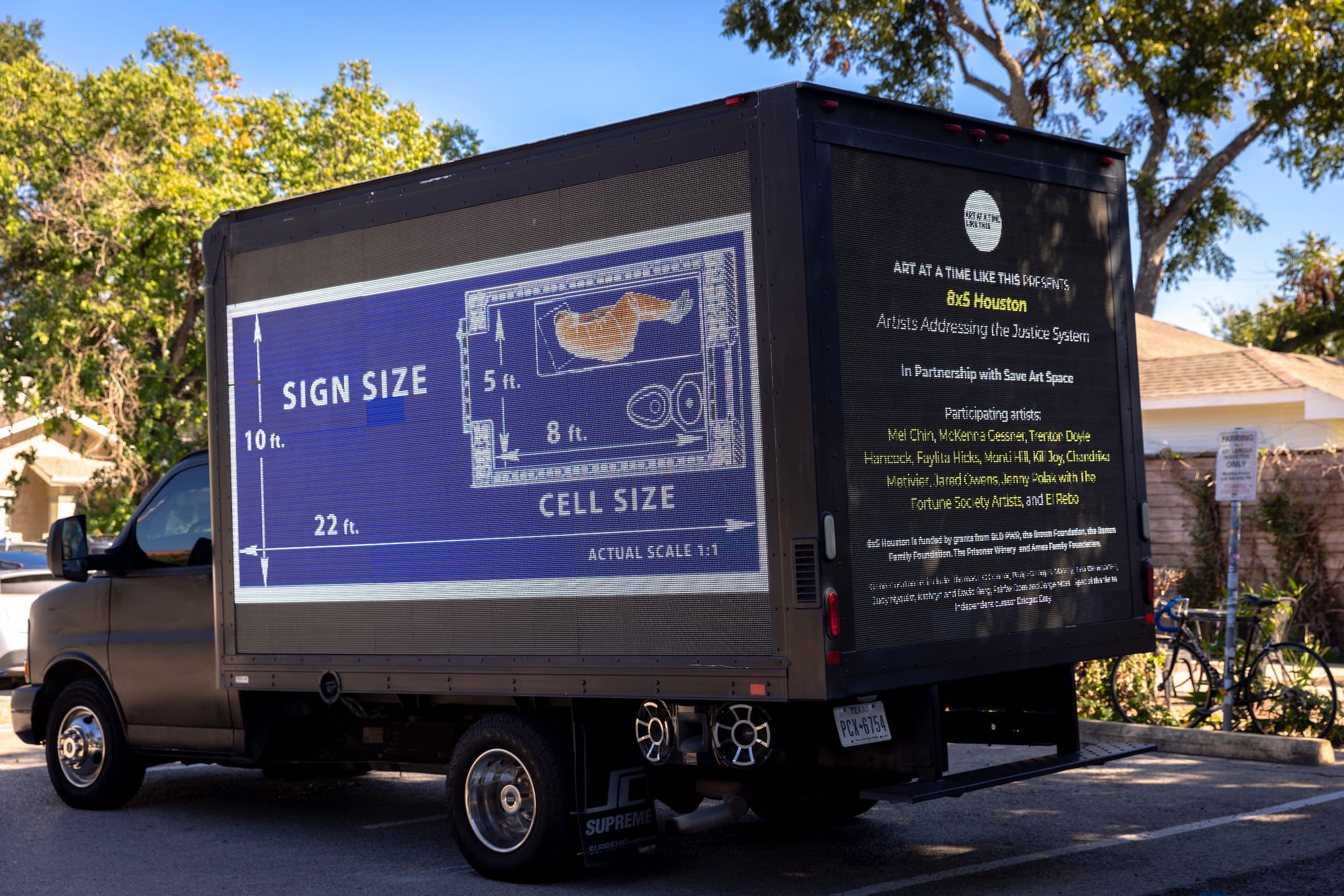 On Saturday, the group held a panel discussion at the Houston Museum of African American Culture. Despite the setbacks, one local company — Premier Mobile — agreed to showcase 8 x 5 Houston artworks on the sides of two trucks. Rothko Chapel, the Museum of African American Culture, Arts League Houston, the Contemporary Arts Museum Houston, and Project Row Houses allowed the vehicles to park outside their institutions, and the trucks circled Harris County Jail later that evening and before the event. ATLT and SaveArtSpace will continue working with Local Premiere for the next few weeks and are considering additional options for display, including banners and wheat-paste posters.