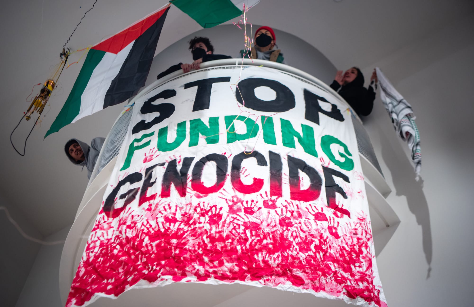 At around 6:40pm local time, midway through the Center's "Love Letter to SOMA" public event, artists Paz G., Tracy Ren, Jeffrey Cheung, Leila Weefur, Sholeh Asgary, champoy, Lukaza Branfman-Verissimo, and Courtney Desiree Morris altered their works with fake blood as well as spray-painted slogans, banners, and posters that read "Free Palestine," "Ceasefire Now," and an instruction to both the YBCA and the US government to "stop funding genocide."