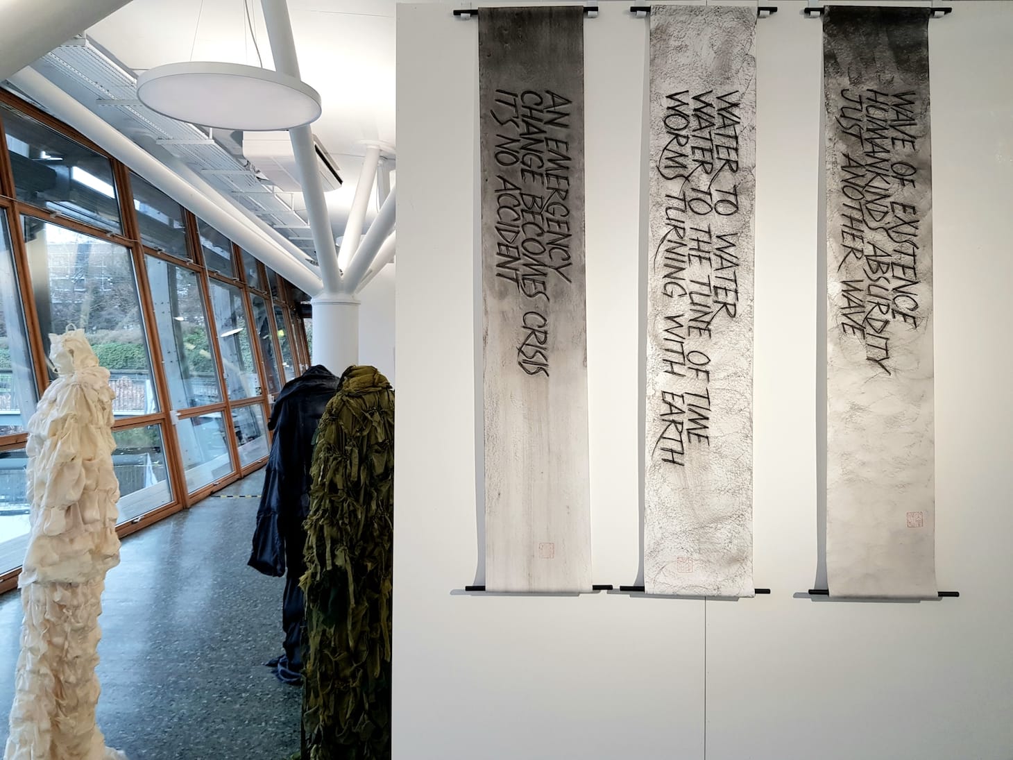 Many of the works on show straddle the divide between art and design. For example, Freya Freeman-Taylor – an environmental activist responsible for much of Extinction Rebellion’s iconic graphic design – presents a poster and collage, while Alisa Ruzavina’s “Stories from the Faraway Land: Armila” (2019) utilizes organic cotton clothing to encourage the use of textiles as a form of everyday environmental activism.