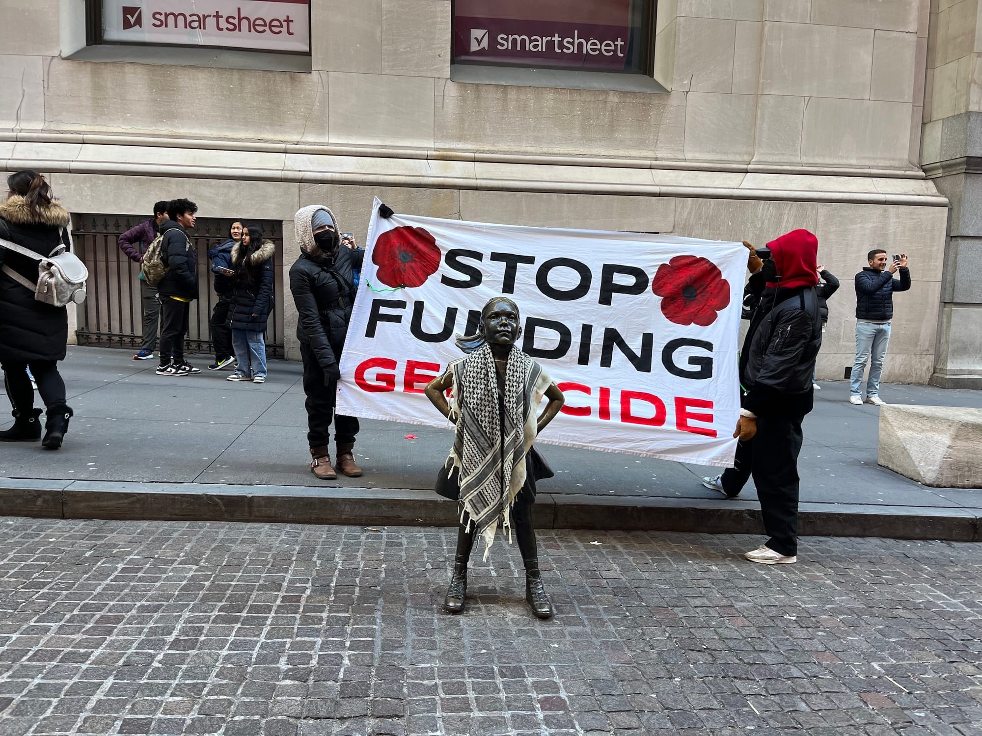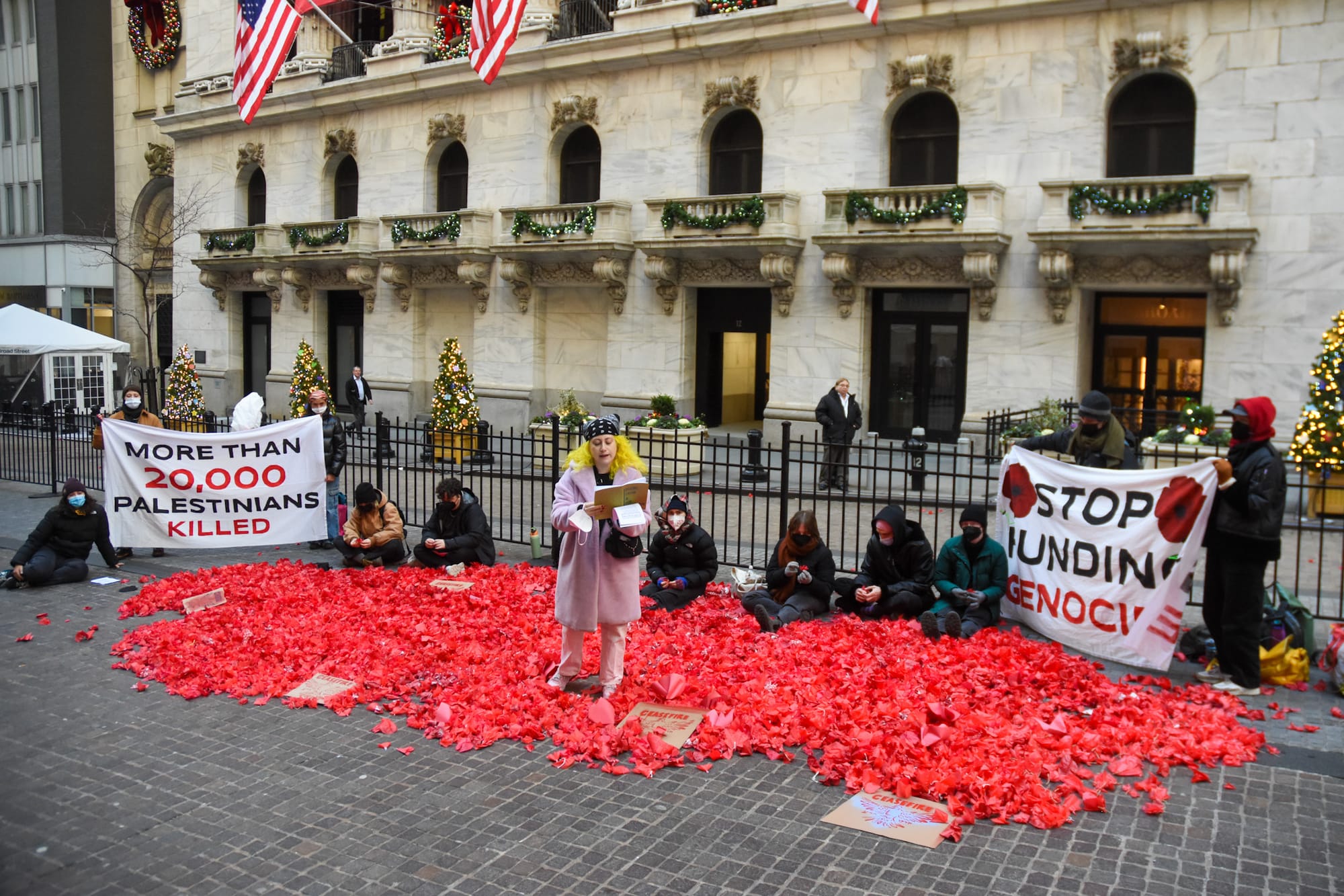 As workers and tourists traversed the cobblestone streets of Lower Manhattan today, December 15, about 20,000 red paper poppies rested in front of the New York Stock Exchange, each flower commemorating the life of a Palestinian person killed by Israeli forces since October 7.