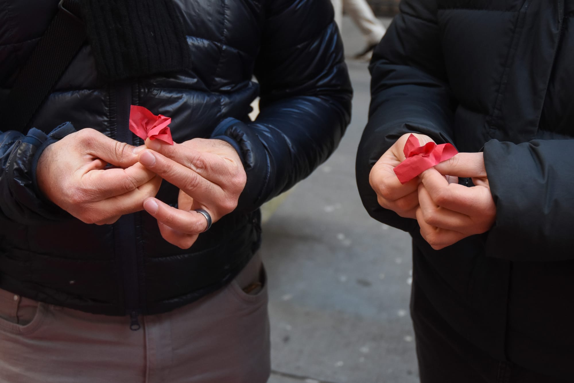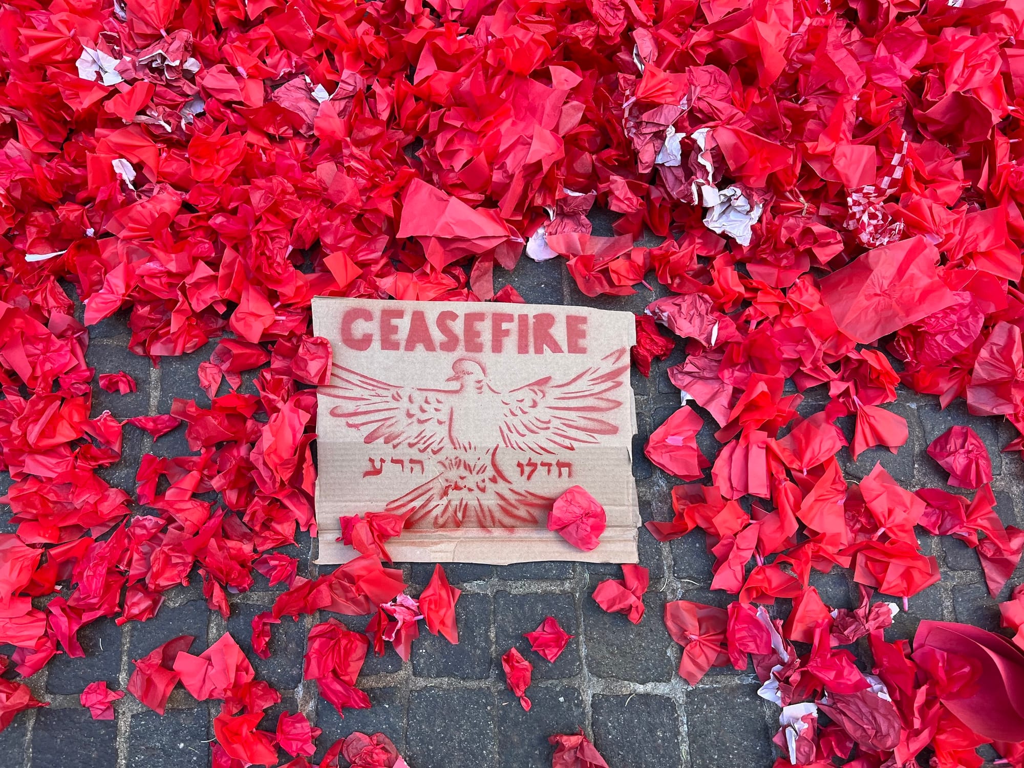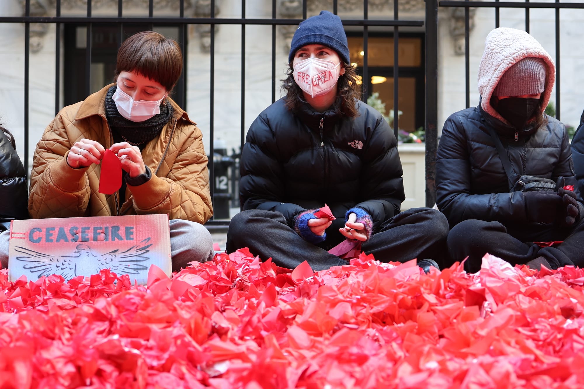 Around 30 artists and activists assembled to create the installation around 9am, some folding pieces of paper, others holding banners that read "stop funding genocide," and a few distributing flyers to passersby. A police car was stationed nearby, but the activists were able to move forward with the action without interruption, leaving the area around noon.