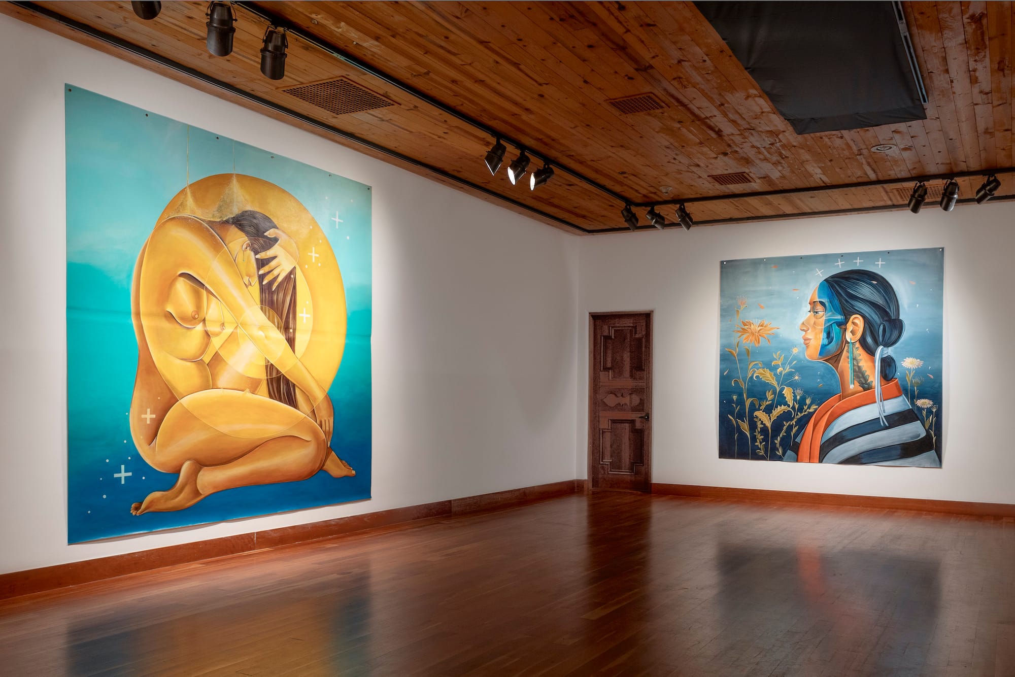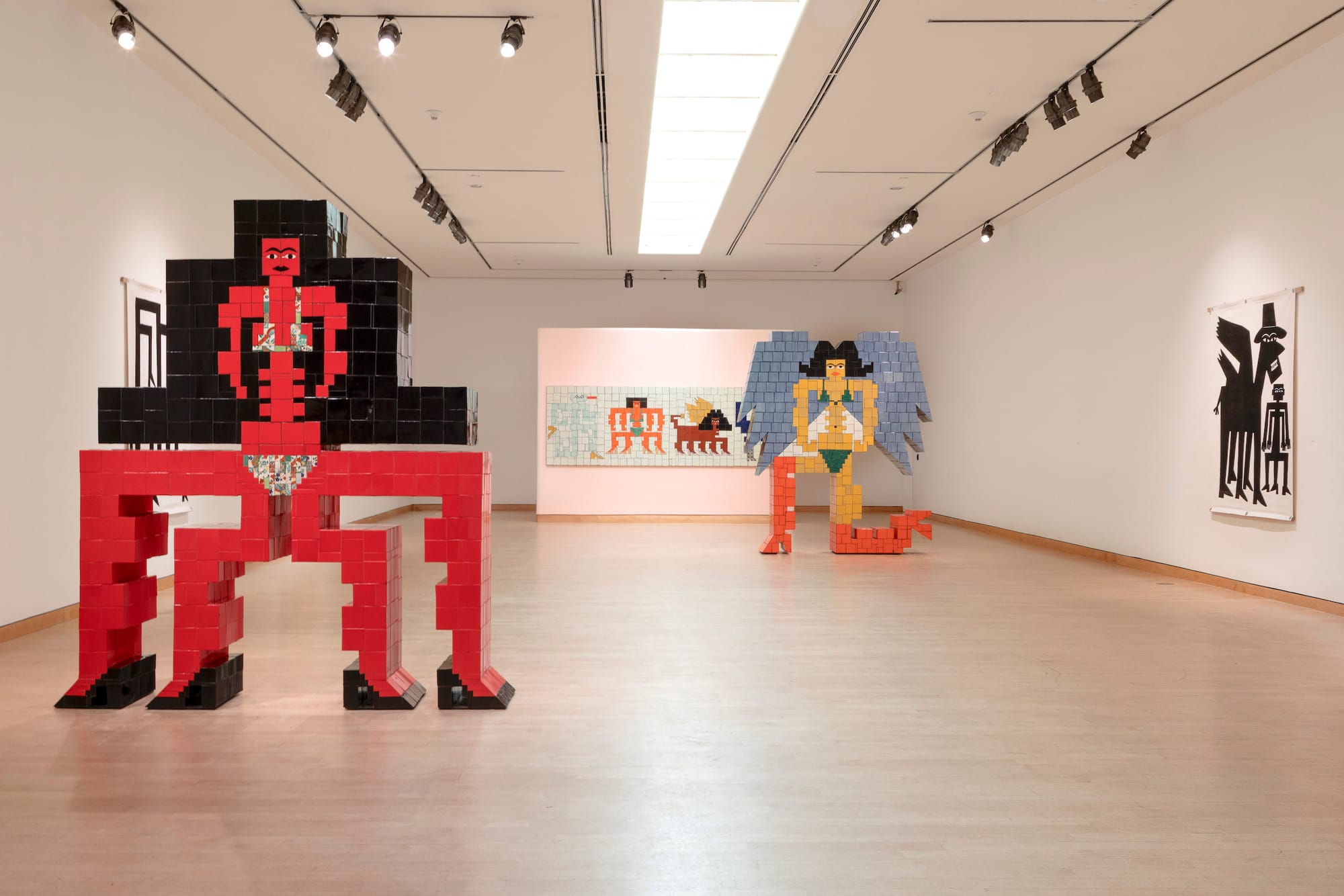 Filling the entire gallery, Among Monsters showcases one artist in each of the six rooms, allowing visitors to become engrossed in the theme. In particular, the sculptural works stand out, even when considered independent of the show’s theme. For example, Esther Elia’s new goddesses imbue large-scale figurative sculptures of women bodybuilders with the presence and posturing of the ancient Lamassu. “Miztanta Protective Deity” (2023), whose dimensionality is formed by flat planes of colorful Mexican tiles, stands mid-squat, jet back hair cascading in a stair-step fashion, hovering just above the bent knees and horizontal thighs of her four legs. In her work, Elia speaks to the experiences of Assyrians in diaspora, informed by notions of strength and of feeling safe or unsafe; with these monumental sculptures, she extends those ideas to incorporate the social media trend she was seeing of Assyrian women in her community posting gym selfies while bodybuilding and powerlifting.