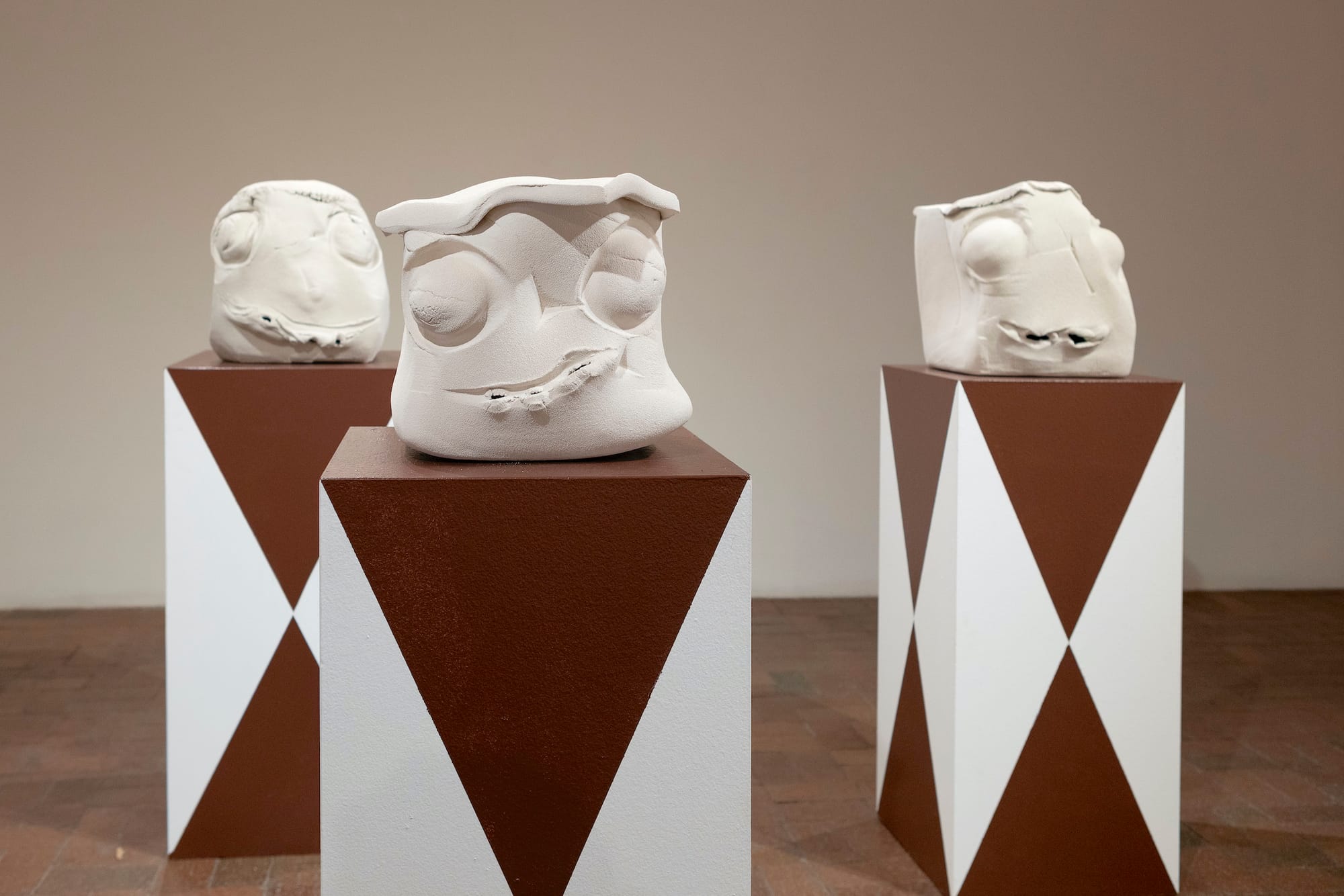 Imagination also plays a vital role in Hank Saxe’s selection of stoneware pieces from the 1990s. Saxe, who lives in Taos, New Mexico, has worked in ceramics for more than 40 years, including industrial and architectural projects, and he brings his practical expertise to his creative process. With titles like “Spanky,” “Switz,” “Petey,” and “Lunk,” these golem heads (or lumps of clay, depending on your perspective) sitting on pattern-painted pedestals, hint at the history of humans wrestling with the supernatural, and the subconscious.