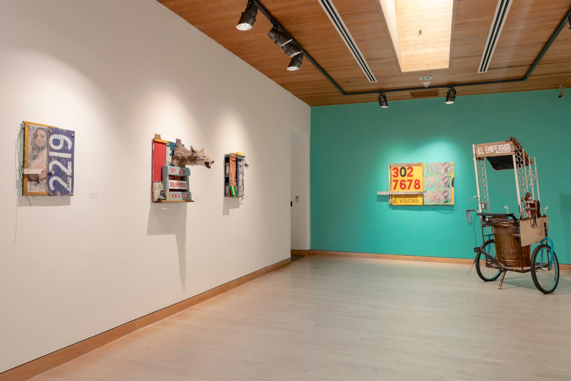 One of the exhibition’s strengths is that its ideas are animated by viewers’ imaginations. I was surprised by how seeing Angelica Raquel’s six-foot-tall felted wool and poly fiber sculpture of a human-animal hybrid, titled “Cursed Spirit of Downtown Laredo” (2023), out of the corner of my eye had me a little unhinged — I’m convinced I saw it move. Raquel’s representations of folklore and accounts of her life in Laredo, Texas, are well served by the details of texture, color, and scale in her felted sculptures of animals, such as the deer head of “Árbol De Vida: El Monte” (2024), and her hooked rugs embellished with buttons, charms, silvered thread, glass beads, and tinsel-threaded yarn, as with “Javelinas Take Our Pumpkin Patch” (2024).